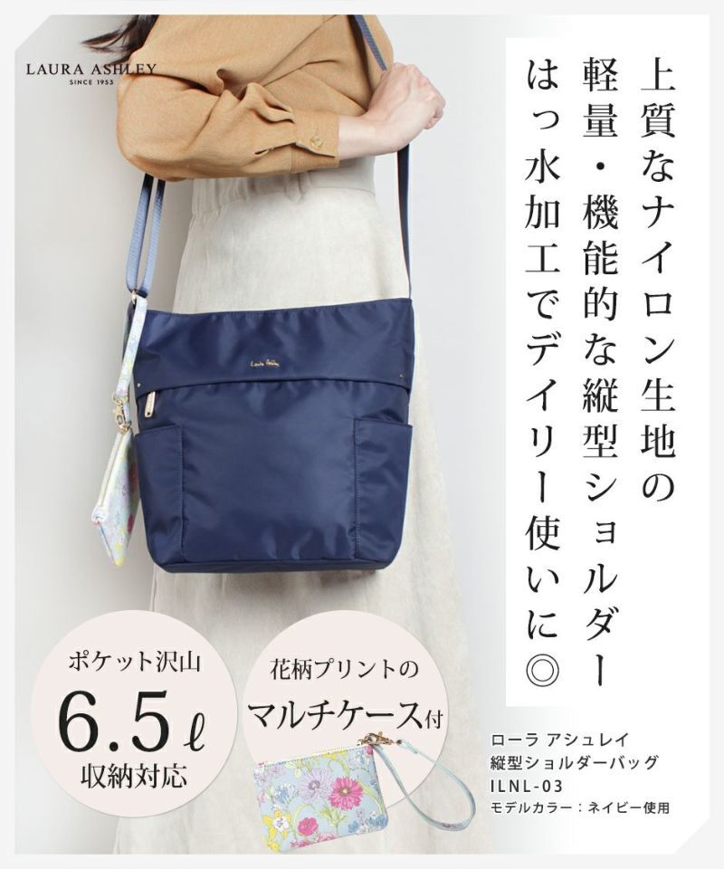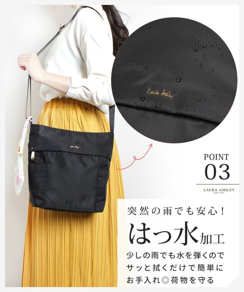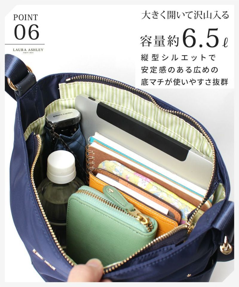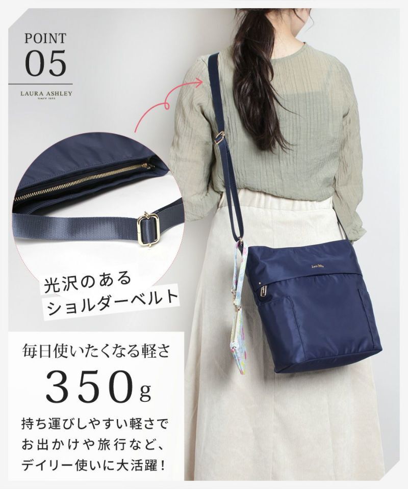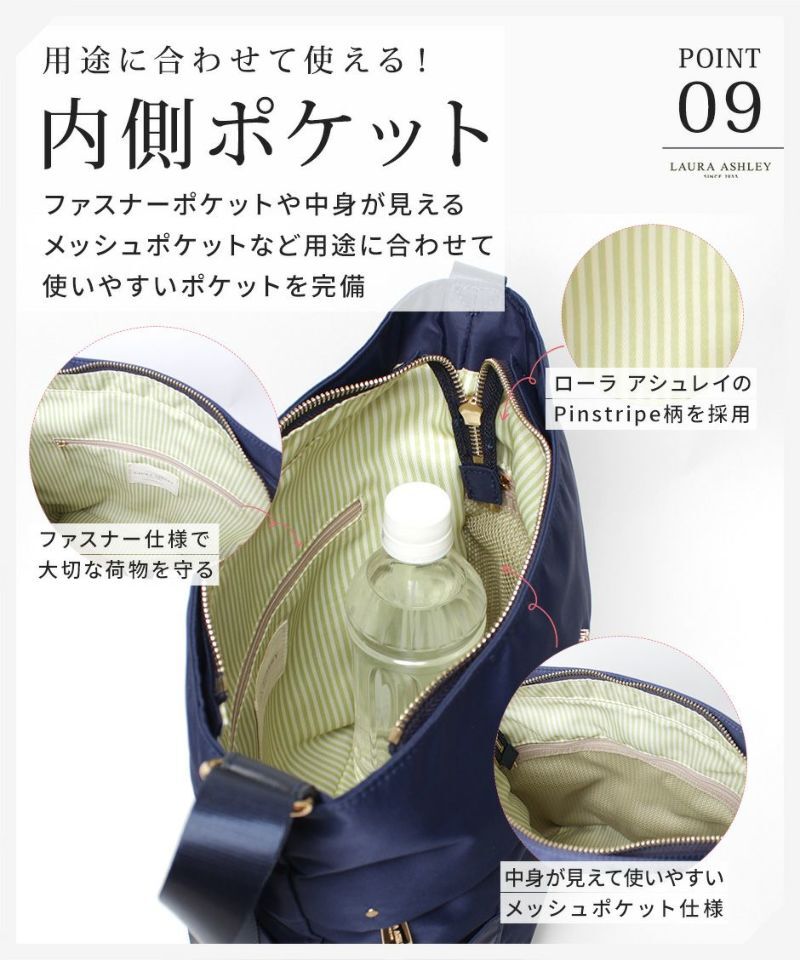 LAURA ASHLEY(ローラ アシュレイ)、ILNL-03は、A5サイズ収納可能で、500mlのペットボトルが縦に収納ができるショルダーバッグです。