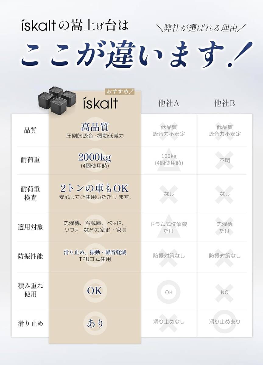 ISKALT 洗濯機用防振かさ上げ台 高さ調節 洗濯機・乾燥機・冷蔵庫用置き台 取り外し可能 家具に傷防止 滑り止め 床に傷防止 耐荷重約2000kg 異音吸収 振動吸収 テーブルの角を守る 自由につなぎ合わせる 1セット4個入り 据付脚IST001