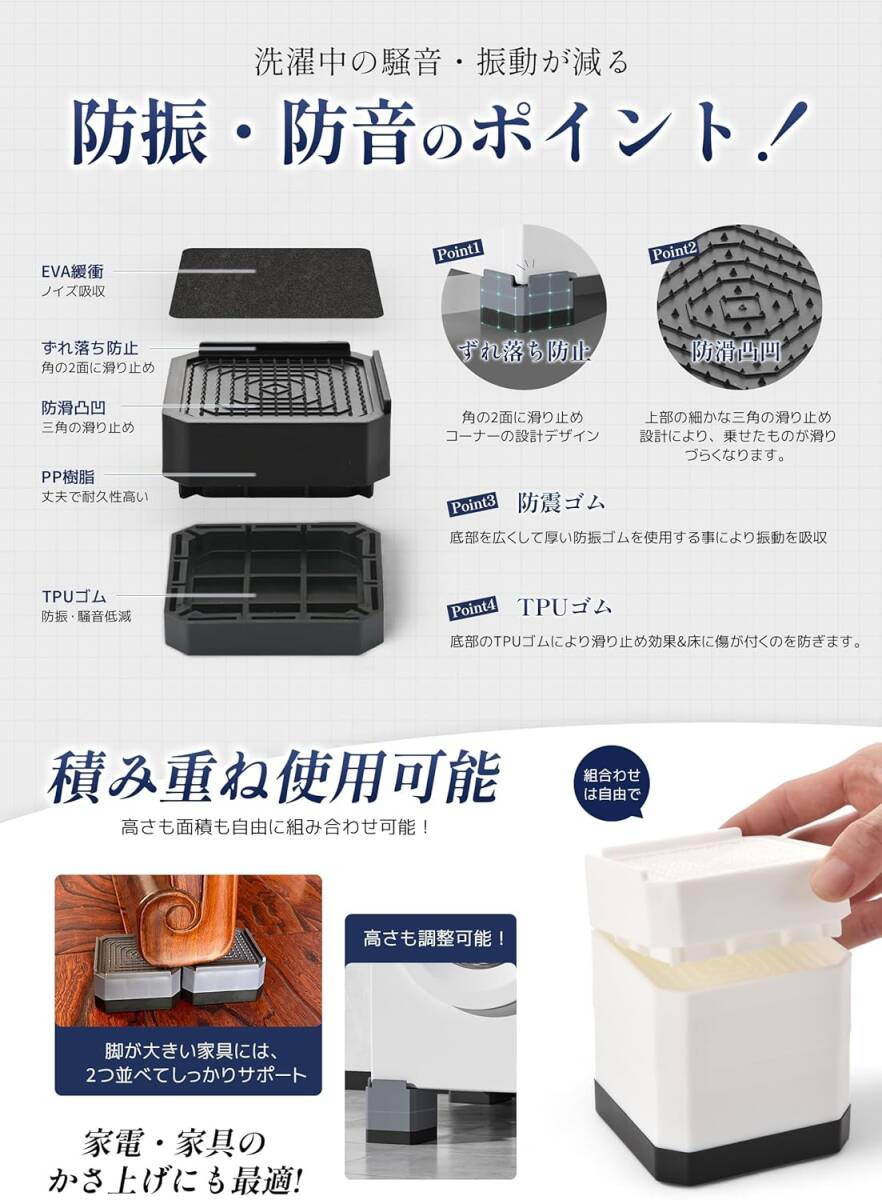 【洗濯機かさ上げ台】 サイズ:8.5L x 8.5W x 4H cm(1層)。セット内容:4個入り。耐荷重:約2000kg(4個使用時)。※適用対象:丸足の直径/矩形足の最長辺が79mm内の洗濯機、冷蔵庫、食洗機、机、ベッド、ソファー、こたつテーブルなどの家電製品・家具(85cm以上はつなぎ合わせる必要があります)。