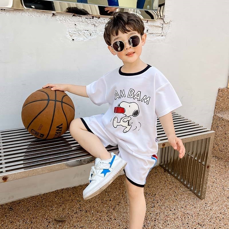 この可愛い上下セットは、世界中で愛されるスヌーピーをデザインした子供服です。シンプルな白ベースに黒の縁取りがスポーティな印象を与え、動きやすくてスタイリッシュ。Tシャツの「BAM BAM」ロゴとスヌーピーの遊び心あるデザインは、お子様のコーディネートに楽しさをプラスします。ショートパンツはウエストゴム仕様で着脱が簡単。サイドのカラーラインがアクセントになっています。