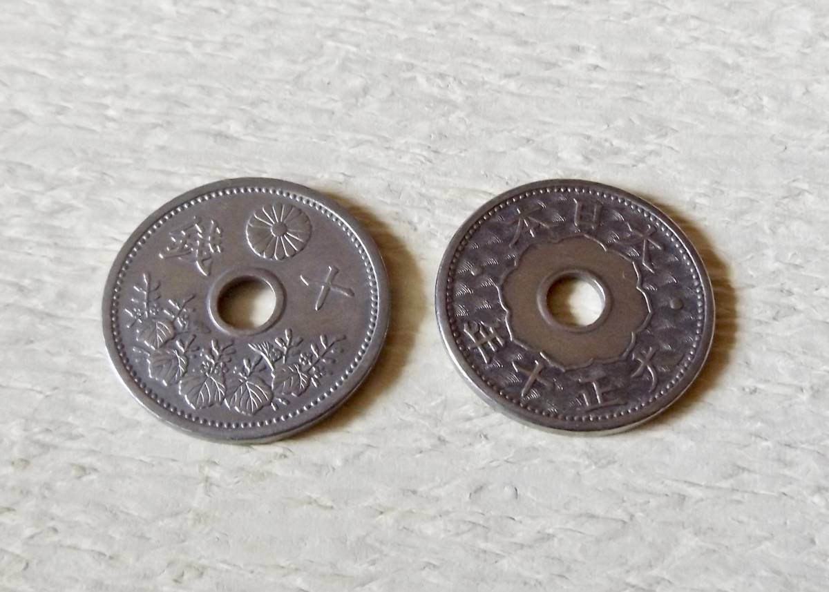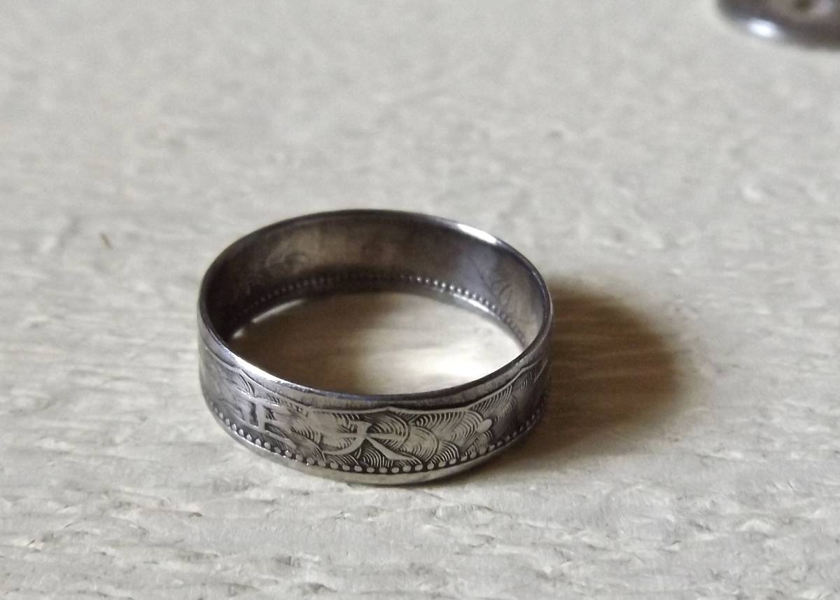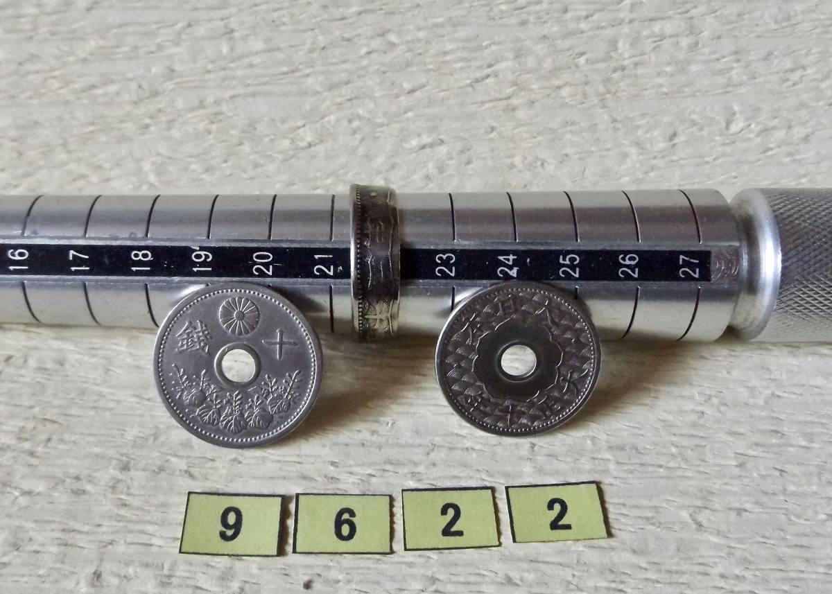 この商品は、大正12年発行の10銭白銅貨を使用。銅貨に穴を明け木槌で叩いてコインリングに成形した1点ものです。