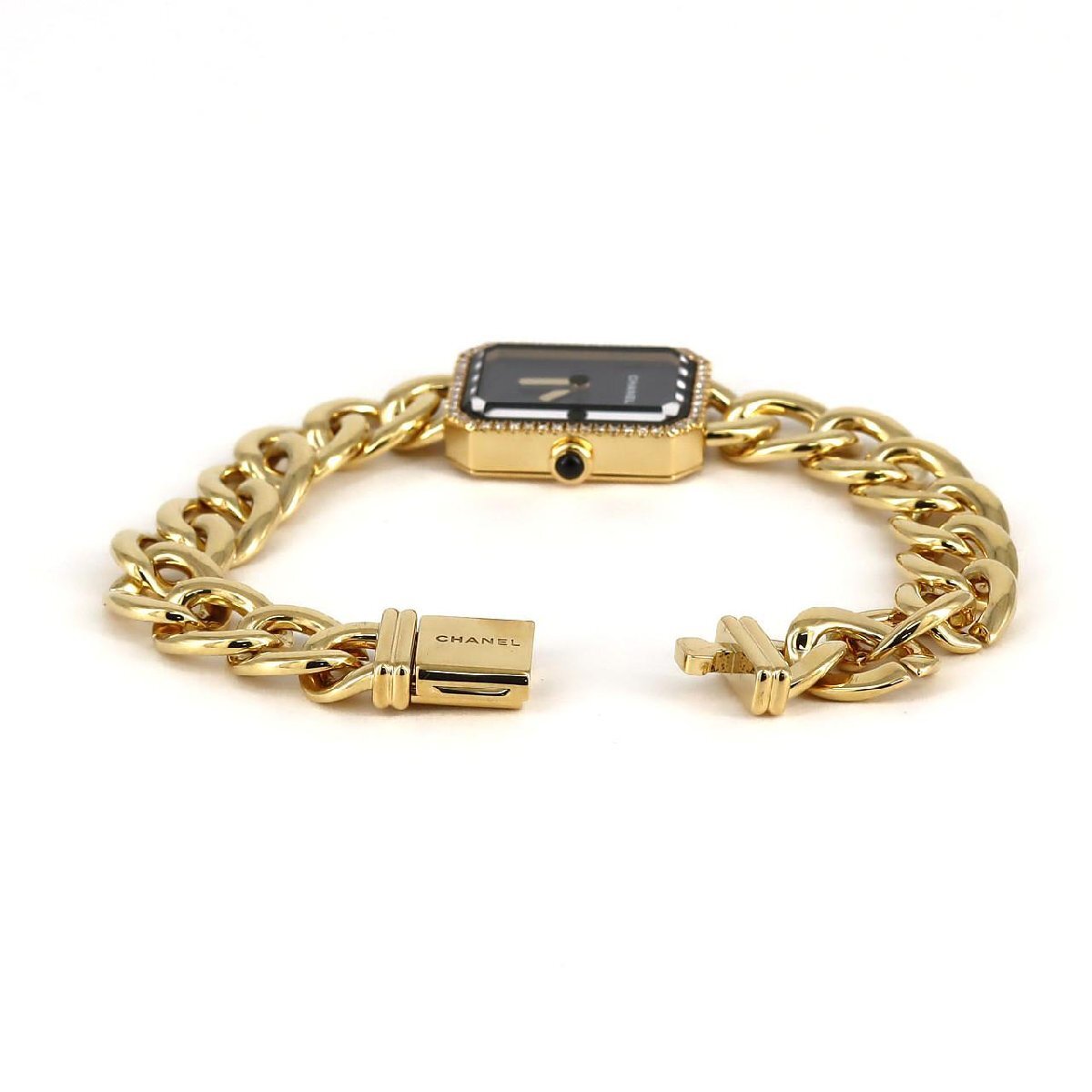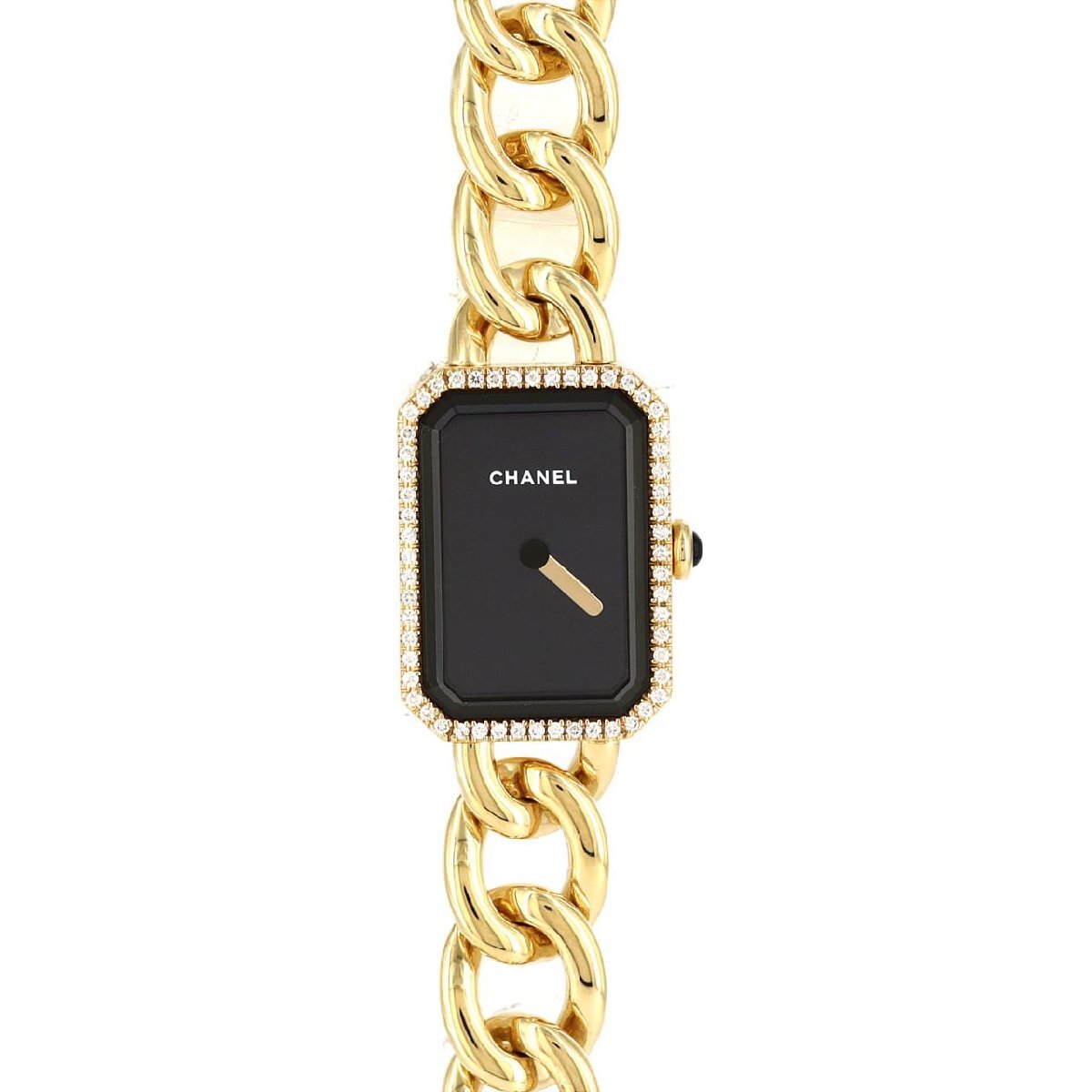1987年に登場した、シャネルにおける最初の時計「プルミエール」。パリのヴァンドーム広場と香水No.5のボトルストッパーからインスピレーションを得た八角形のケース、チェーンショルダーを想起させるブレスレットなど、シャネルのアイコンが盛り込まれた人気モデルです。こちらは金無垢ケースにダイヤがあしらわれているので、ゴージャスで存在感があります。