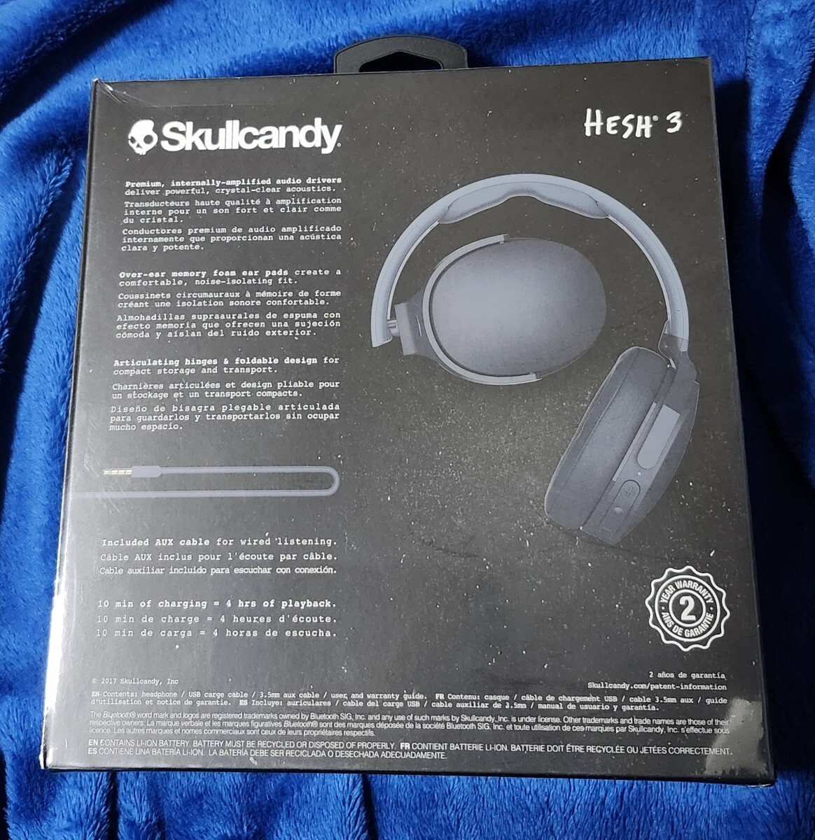 ★Skullcandy Hesh 3 Wireless ワイヤレスヘッドホン Bluetooth対応 BLUE S6HTW-K617【国内正規品】 【商品スペック】 ・本体重量:200g ・タイプ:オーバーヘッド型 ・Bluetooth:Bluetooth対応 ・再生周波数帯域20Hz~20KHz ・インピーダンス33Ω ・防水・防滴防水・防滴非対応 ・リモコン・マイクリモコン・マイク対応 ・付属品マイクロUSBケーブル(充電用)、3.5mmオーディオケーブル(1.2M) 【商品仕様】 ■BLUETOOTH: Ver4.1 ■対応コーデック: SBC ■連続再生時間: 約22時間 ■急速充電対応: 5分充電で90分、10分充電で4時間使用可能 ■通話・選曲・音量コントロール機能 ■マイク: あり ■有線での使用可能 ■付属品: マイクロUSBケーブル(充電用)、3.5mmオーディオケーブル(1.2M)