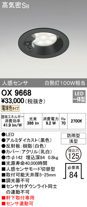 【店舗用】ダウンライト★人感センサー★LED★高気密Sa★防雨型★軒下取付専用★照明器具★オーデリック★OX 9668★税込36300→特9800円
