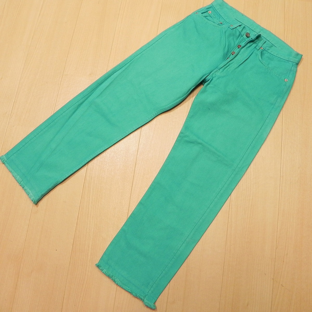●あくまでも古着のため、ノークレームノーリターンでお願いいたします。使用感はございますが、穴などのダメージはございません。色はターコイズ系です。薄汚れがございます。 裾が切りっぱなしの状態です。