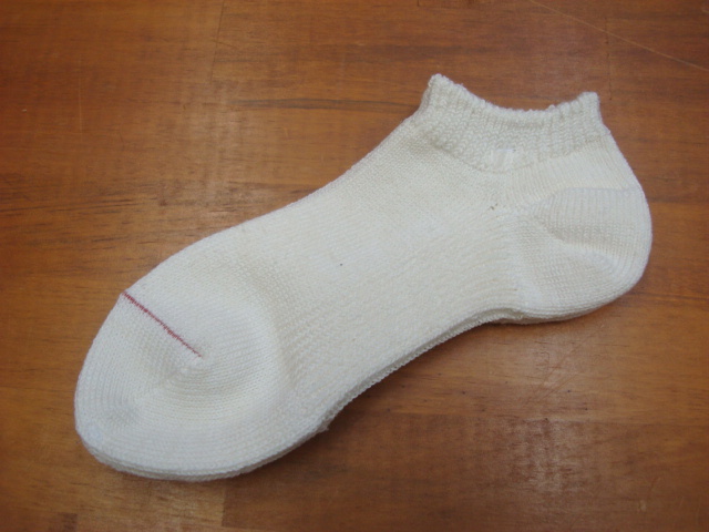 新品Mauna Kea(マウナケア)ソックス 畔編みスニーカー MENS Off White102180です、正式名は→畔編みスニーカー MENS 102180、正式カラー名は→Off White、素材はCotton 65%Hemp 35%です!Mauna Kea(マウナケア)のソックスの中では少し薄手でシンプルですが非常に合わせやすく雰囲気のいい畔編みスニーカーソックスです!サイズは25-27cmのワンサイズです!まだお知りでならない方にソックスブランド mauna kea (マウナケア)の説明です!もとは足袋や素足の文化だった日本に、靴下が普及しはじめたのは明治時代。文明開化とともに洋装が一般化し、革靴に合わせて履かれるようになった。そうした需要を受け、明治後期より靴下の生産が盛んになったのが奈良県広陵町である。江戸時代より綿花と木綿の産地だった広陵町は、その背景を活かして海外より靴下用の手回し編み機を導入。大正時代には自動編み立て機も導入され、米作農家が農閑期に行う副業として広まった。戦後の最盛期には、地元の組合に200軒以上の靴下工場が加盟していたという。現在でも国内で生産される約6億本の靴下のなかで、日本有数の靴下の産地である奈良県広陵町はシェア約4割と日本一を誇っているのです。mauna keaで使用しているのは多彩な色糸とネップが不均一に混ざった杢糸。機能性と天然素材にこだわり、吸湿性と速乾性を兼備させるためにコットンにヘンプを混紡した素材です。厚手の生地ですので丈夫で抗菌消臭効果もあり汗を吸収する素材と水分を発散する素材を混合しているので、蒸れにくく爽快な履き心地がオールシーズン持続します!またゴム部分の締め付けを一箇所に集中させず、ゴムの範囲を広くとることでゴムの締め付ける力を分散しています。この結果ゴム部分が蒸れにくく、痒みなどのお肌へのストレスの軽減、 また、ズレの防止効果を実現しました。靴下は筒状に編まれるのですが、編み機の特性上、径の太さは一定になります。そのため、パターンで履き心地を出すには限界があり、編み目と糸の太さが重要になってきます一般的な編み機で靴下を製造する場合、その針数が170本~180本なのに対し、日産80本ほどと規模は小さいながらも、25年以上も前から稼動し続けるこの編み機はその3分の1である60本です。針数60本の靴下は、一般的な180本の編み機よりも編み目に余裕があり、糸も通常より太いものを使うことができる。つまり余裕のある編み目がそれぞれの足のカタチに沿うため、とても履きやすい靴下になるというわけです。編み機が古いものなので日本国内にはほとんど残っていませんが、ザックリとした編み目はこれでしか再現できません。麻と綿の微妙なバランスそして土踏まずを刺激するサポーター履き心地は抜群に良くこの混率が汗を吸い外へ出しあの嫌なベタベタ感が無く何時でもサラサラで快適また丈夫で長持ちも致します。現在は吸湿速乾性をうたった化学繊維の靴下などもありますが、それは天然素材が本来もっている機能を再現したにすぎず、ウールやヘンプでもその特性をうまくコントロールすれば十分快適な靴下はつくれるんです。靴を脱いだ時、こんな靴下はいてたら、素敵じゃないですか?たかが靴下!されど靴下です!色の方は、各パソコン、デジカメによって多少異なりますので、ご了承下さい、ノークレーム・ノーリターンでお願いいたします。ご質問に関しましては、火曜日を除く、午後12~午後9(21)時までに、お早めにお願い致します。この商品以外も、その他、色々出品しておりますので、是非ご覧下さい。