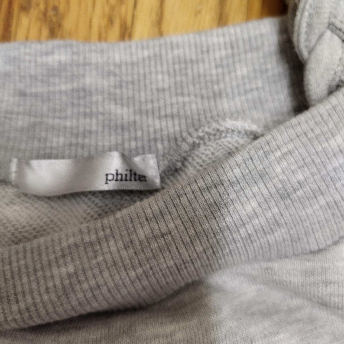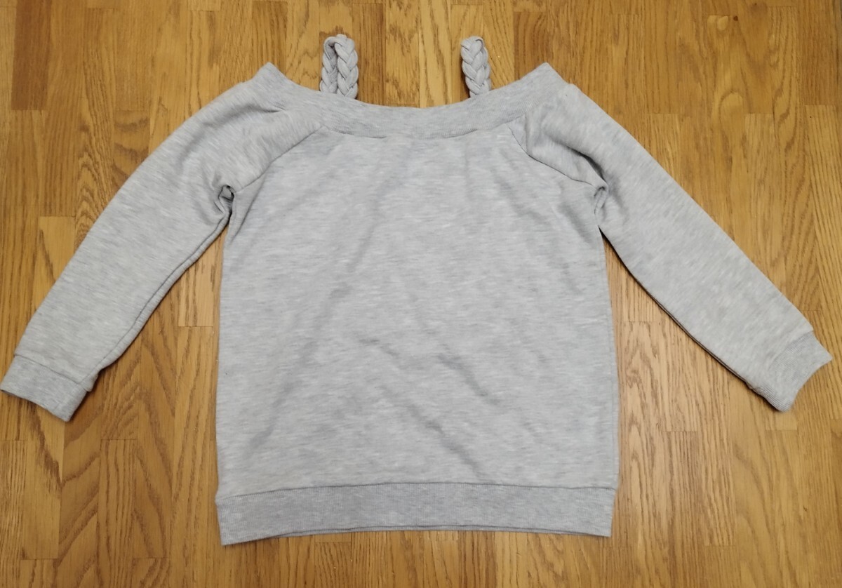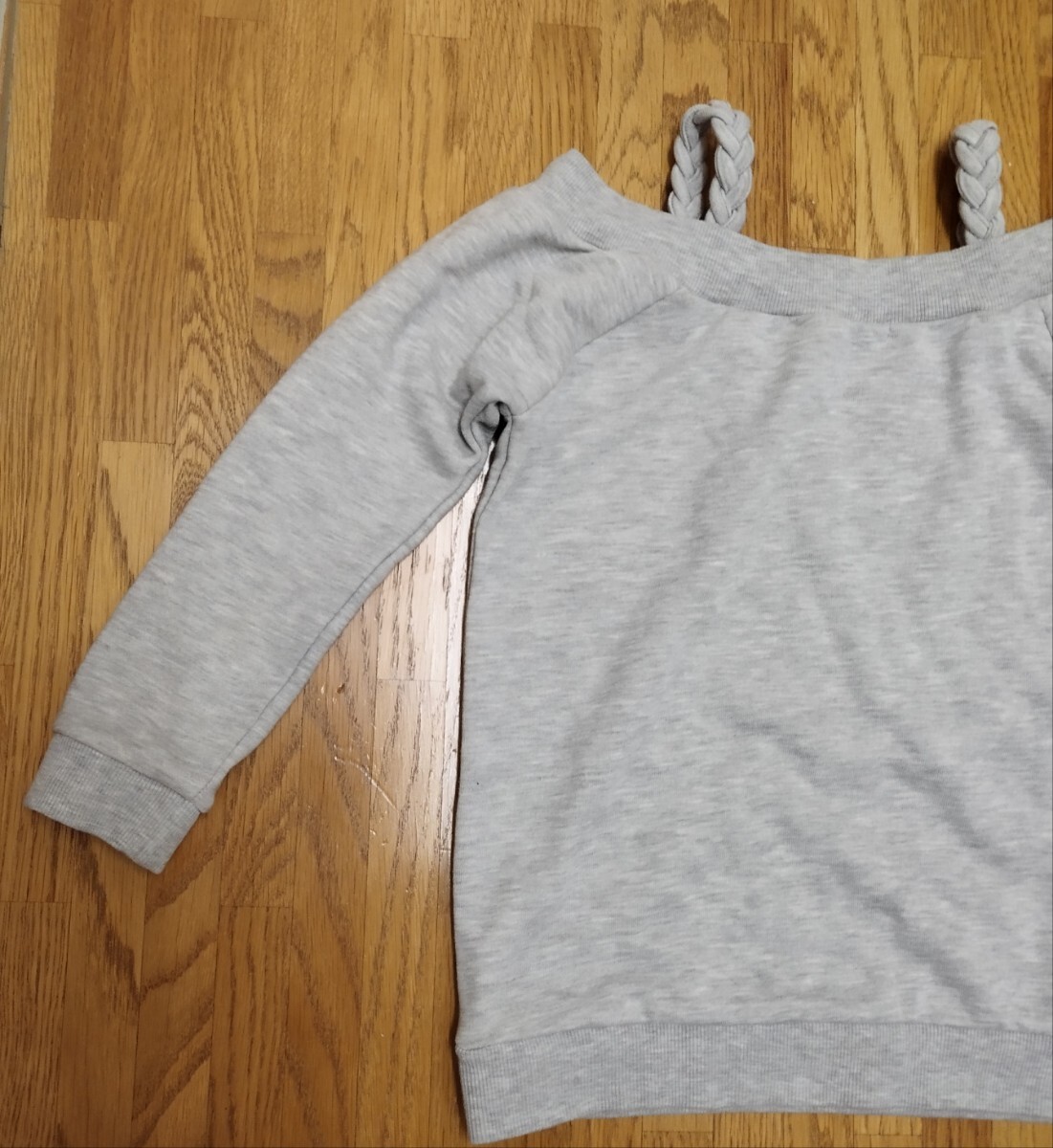 オフショルダーと編み上げストラップが特徴のグレーのスウェットトップス。