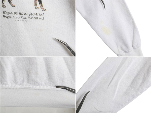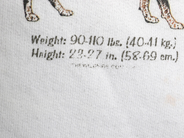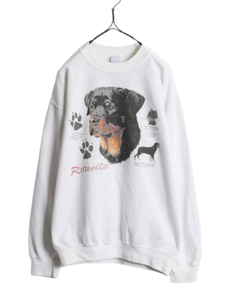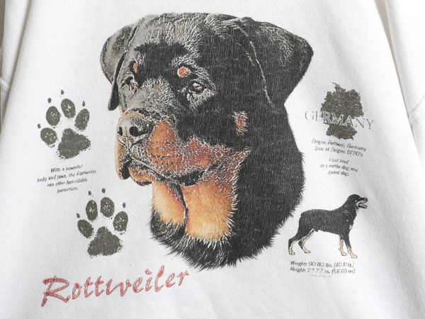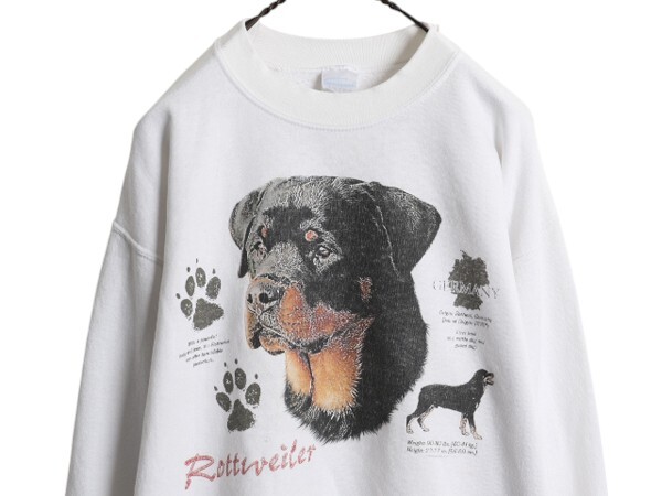 90年代のオールド ドッグ アート イラスト プリント スウェットです。 ボディーは、ボディは、GILDAN ( ギルダン ) 素材は、50% COTTON 50% POLYESTER 柔らかい着心地抜群の裏起毛スウェット素材が使用されています。 比較的薄手でインナーとして着込んだ際もかさばりません。 合わせやすい、ホワイト ボディ フロントに ロットワイラー のイラストプリント入り 現行では見られない細かいタッチの多色刷りプリント 同年代のアニマルデザイン等でよく見かける THE WILD SIDE のコピーライト入り 数々の犬種のプリントが存在する人気シリーズ 男女ともに注目度の高いオールドのアニマルアートのアイテム Tシャツに比べ、玉数の少ないスウェット 古着ならではのグッドデザイン ゆったりとした人気のシルエット これだけで様になる商品です。 男女兼用で着用可能です。 実寸をご確認ください |