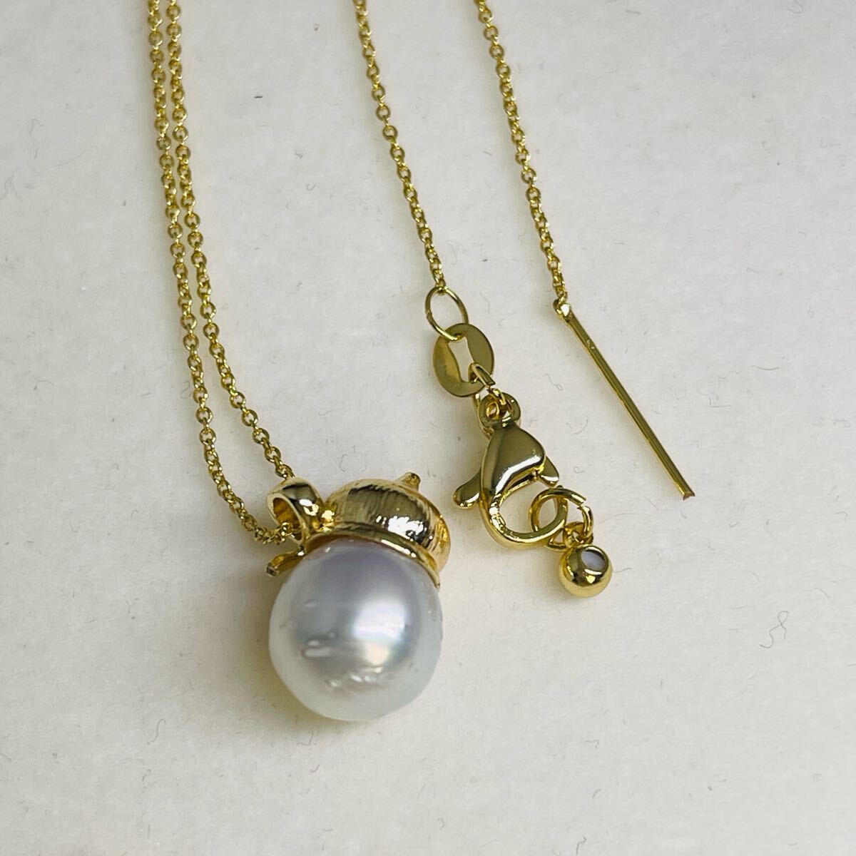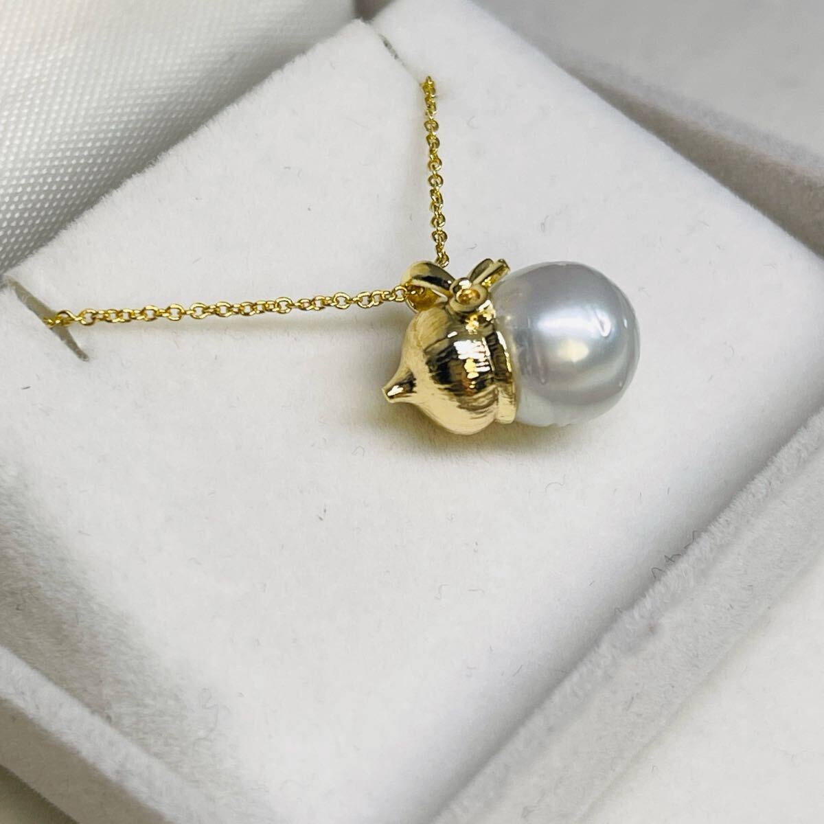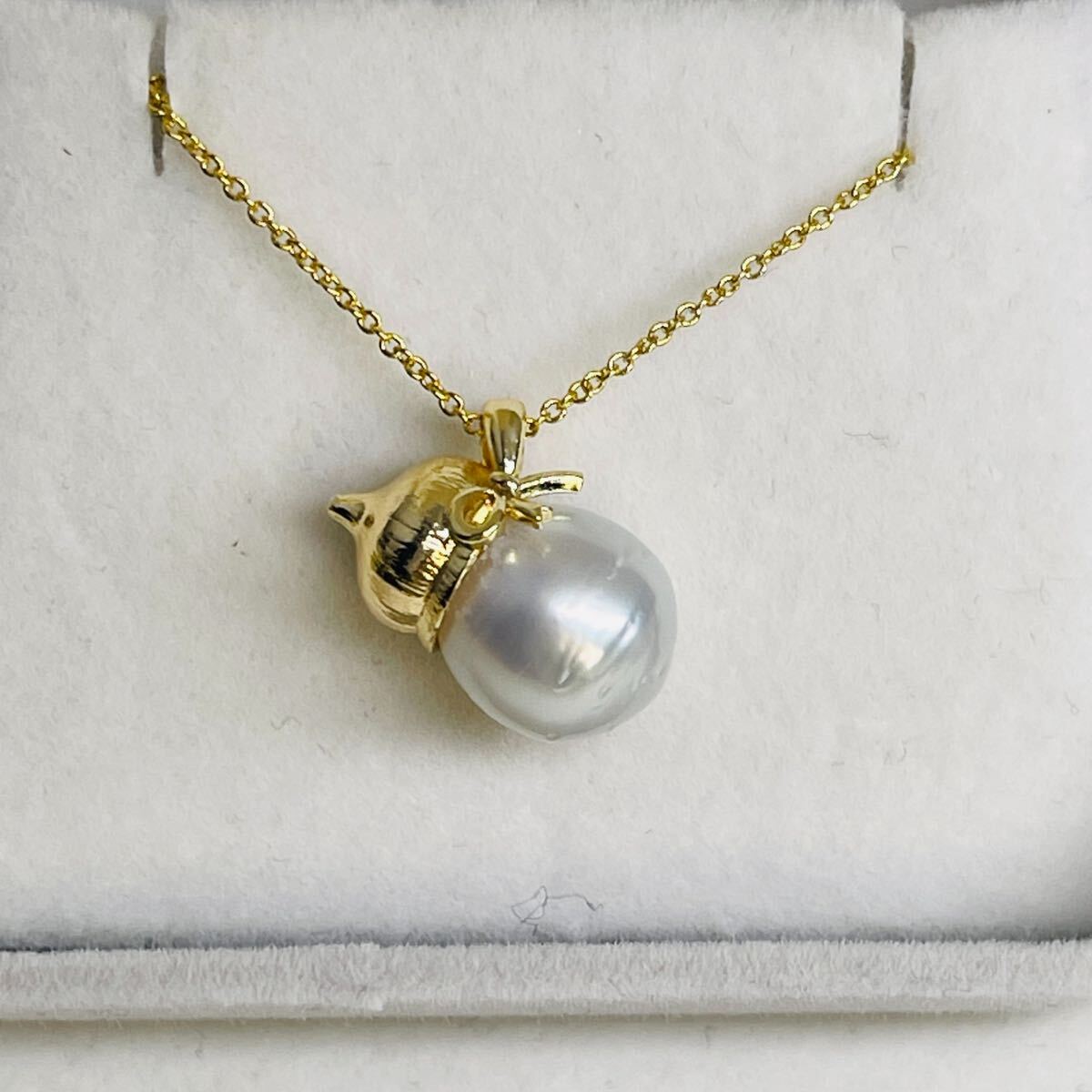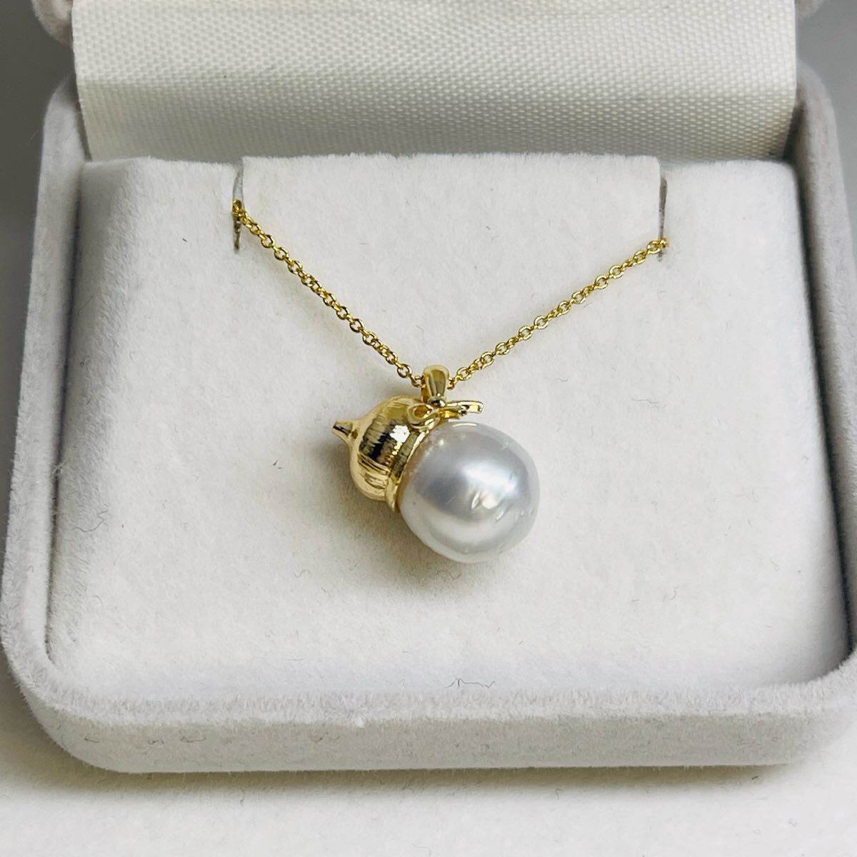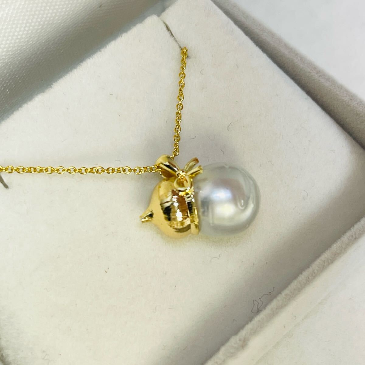縁起の良い福袋モチーフの本真珠ペンダントネックレス。昔の巾着袋やひょうたんを思わせる愛らしいフォルムで、「福・禄・財」を象徴し、金運や幸運を引き寄せるデザインです。上品な本真珠の輝きが首元を華やかに彩り、普段使いから特別な日まで幅広く活躍。お守りジュエリーとしてもおすすめの一品です。