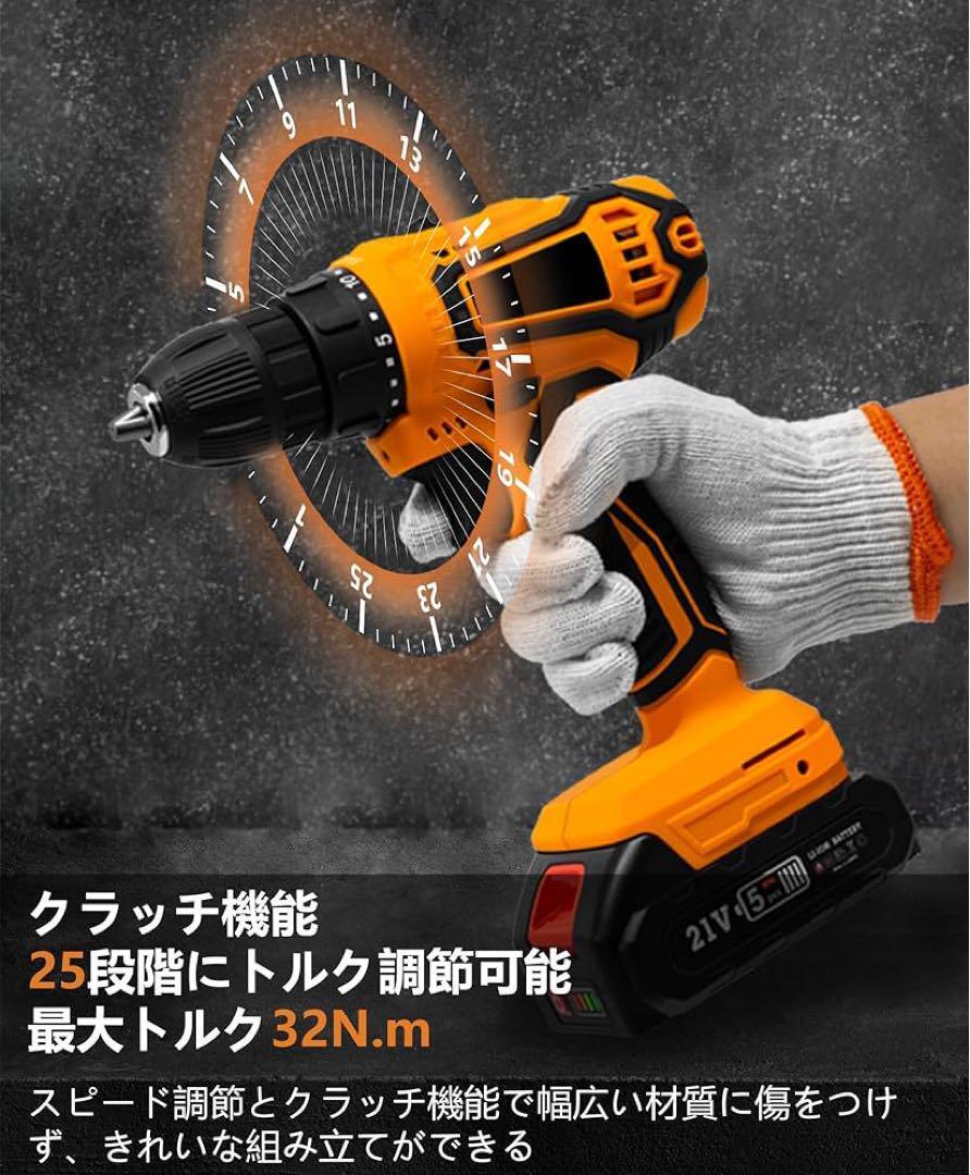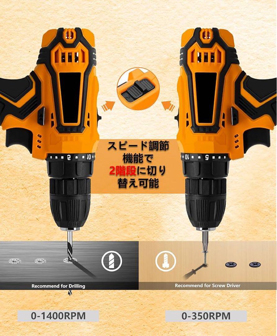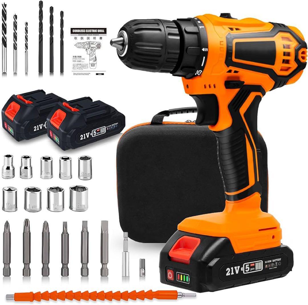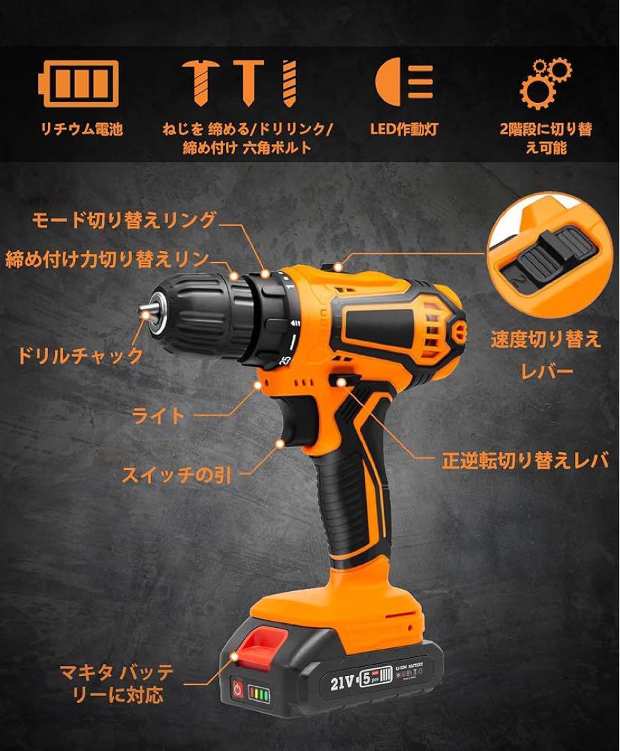 (21V高性能電動ドライバーセット)3-in-1充電式電動ドリルとドライバー。家具の組み立て、木材の穴あけ、ネジの締め付けなど、さまざまな作業に役立ちます。コードレス設計により、電源がない場所でも使いやすくなります。1.5 Ah x 2つの大容量バッテリー(マキタバッテリーと互換性がある)ので、長期間連続して動作することができます。わずか2.6ポンド(1.2kg)(バッテリーを含む)の重さで、軽量なので、片手で持つことができ、女性でも簡単です