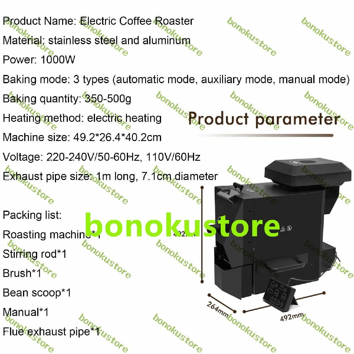 製品名: 電気コーヒー焙煎機 ベイクドビーンズの量:350~400g 製品サイズ: 49.2x26.4x40.2cm 電源電圧:220V/110V 加熱方法:電気加熱 パック: 1xホスト 1x かき混ぜ棒 1x ブラシ 1x 豆すくい 1x 排気管 1x ユーザーマニュアル