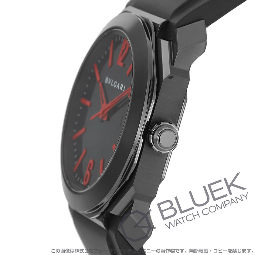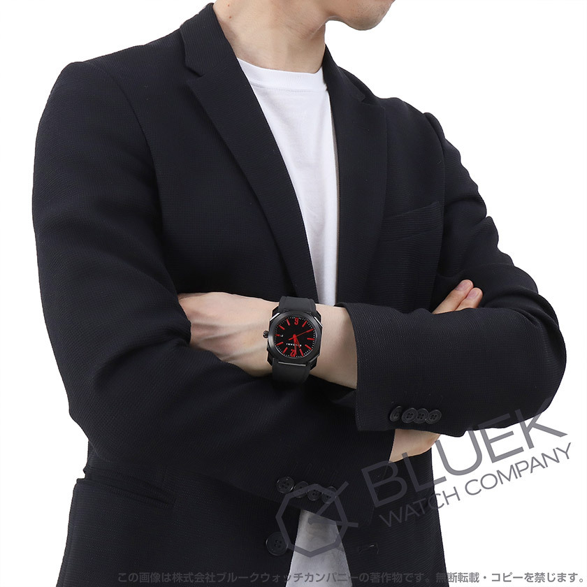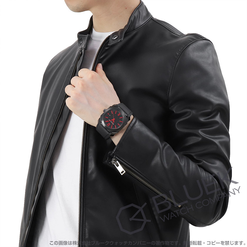 | 古代ローマ建築に着想を得たシャープな八角形ボディに丸いベゼルを合わせた厚さ11ミリの41ミリ100m防水ケースからラバーベルトまでフルブラックでまとめられたオクトウルトラネロは、レッドの指針&インデックス映えるブラックラッカーダイヤルが視認性を高めて男性の装いを手元からスタイリッシュに彩るブルガリ人気のタイムピース。自動巻きムーブメントcal.BVL191ソロテンポを搭載して3時の窓に日付を表示します。中でもケースに硬くて耐摩耗性に優れたDLC“ダイヤモンドライクカーボン=硬質炭素膜”コーティングが施されたつくりもタフなこのモデルは、使い勝手に優れるラバーベルトも魅力。ケースバックからは機械の意匠が鑑賞できてメカ好きの目を楽しませます。 |
