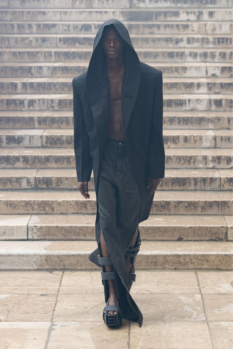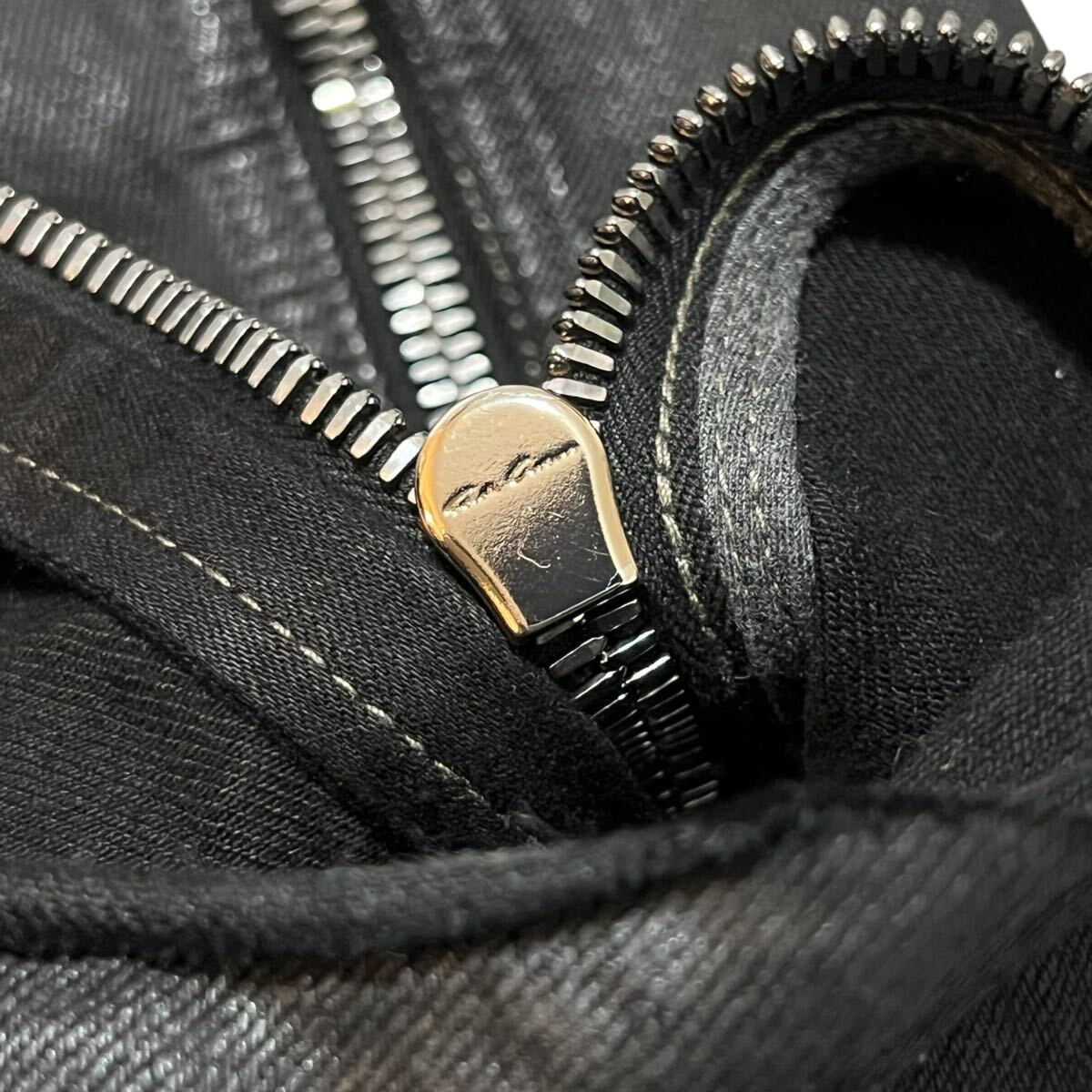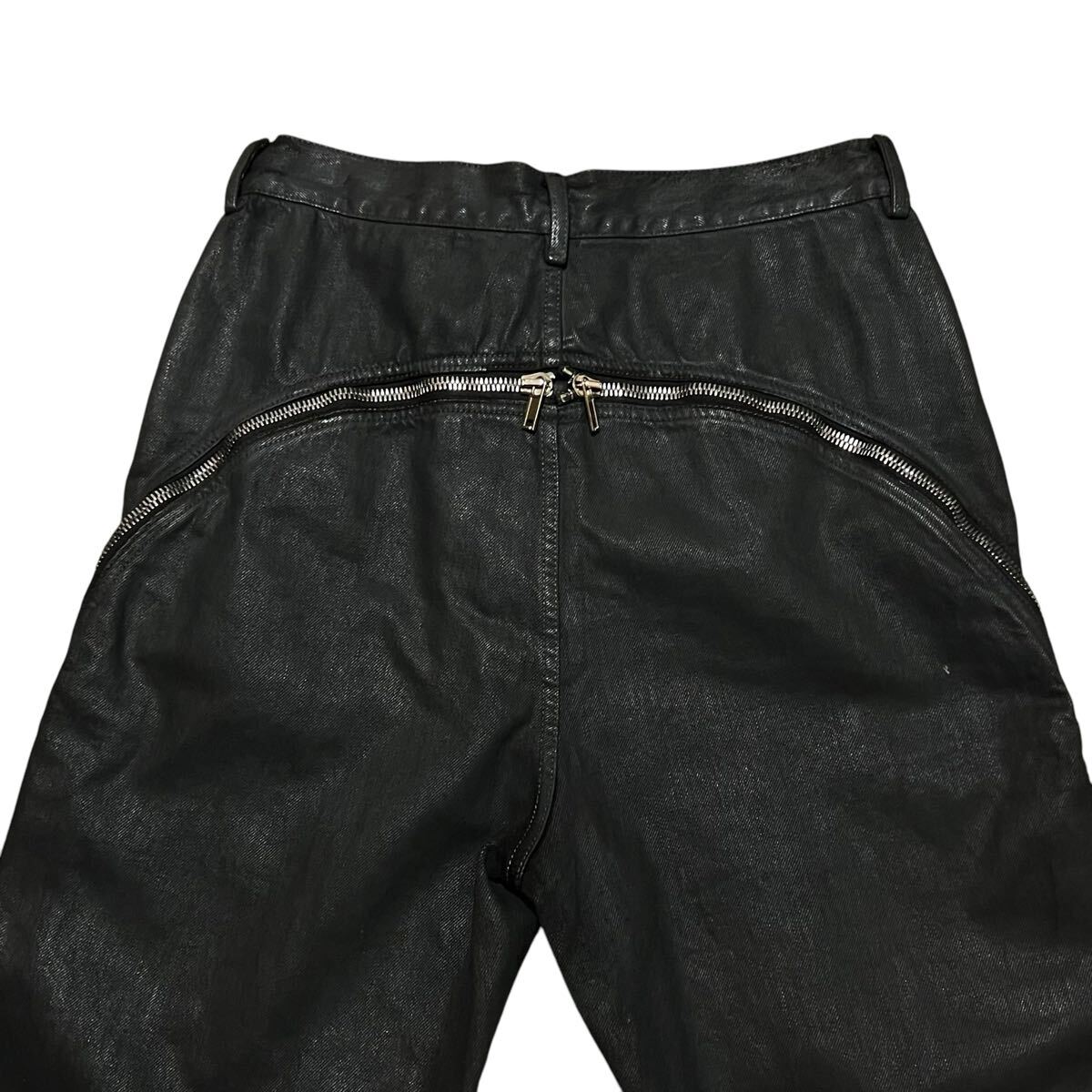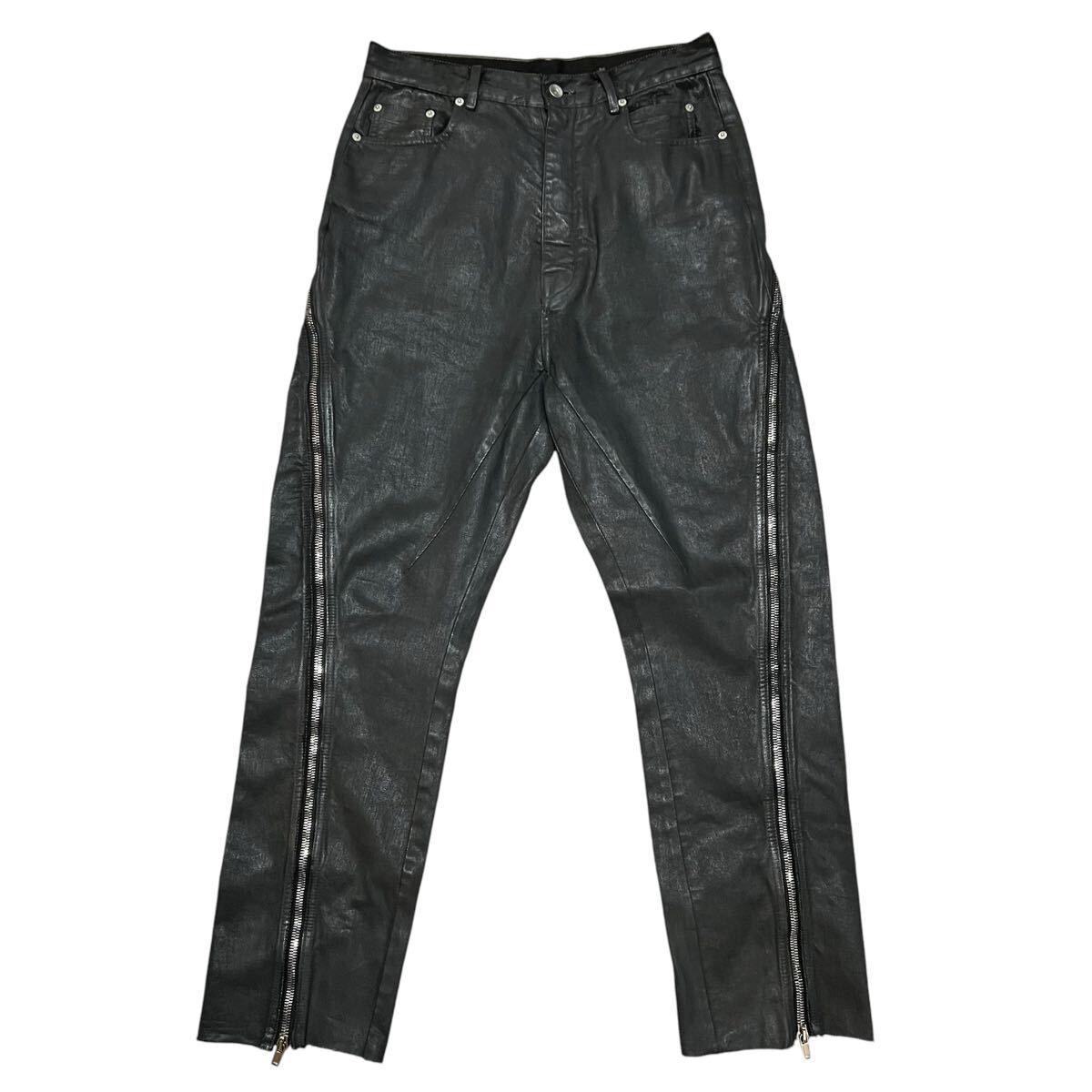 RICK OWENS 2024SS「LIDO」コレクションのBolan Banana Flare Pants。アイコニックなフレアシルエットに加え、ブラックワックスコーティングが施されたデザインが特徴的。両サイドのジップディテールが大胆な印象を与え、開閉によってシルエットの変化を楽しめる。さらに、バックにもジップが配されたアヴァンギャルドなデザイン。