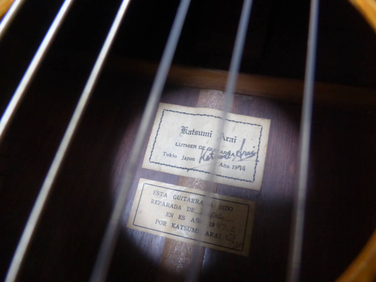 ■Katsumi Arai 荒井勝巳 クラシックギター 1976年製です。状態の方ですが、経年劣化、傷、擦れ等、出来る限り画像にのせていますので、ご確認下さい。ナット幅51mm 弦長641mm 12F上4.2mm位です。サドルはもう少し削れます。本体とオマケのケースになります。事故の無い様にしっかりと厳重梱包にて発送致します。気になる事はご質問の方をお願い致します。
