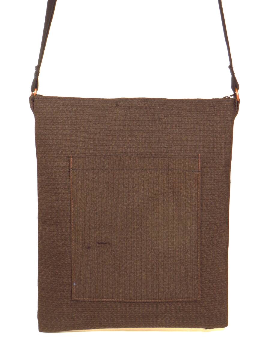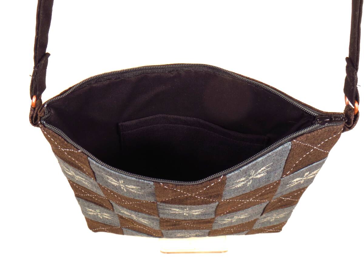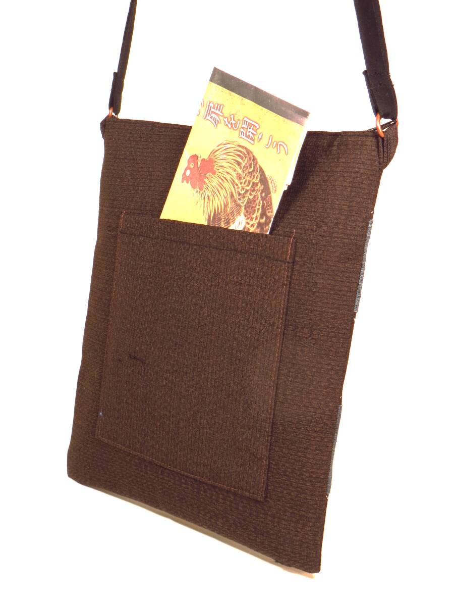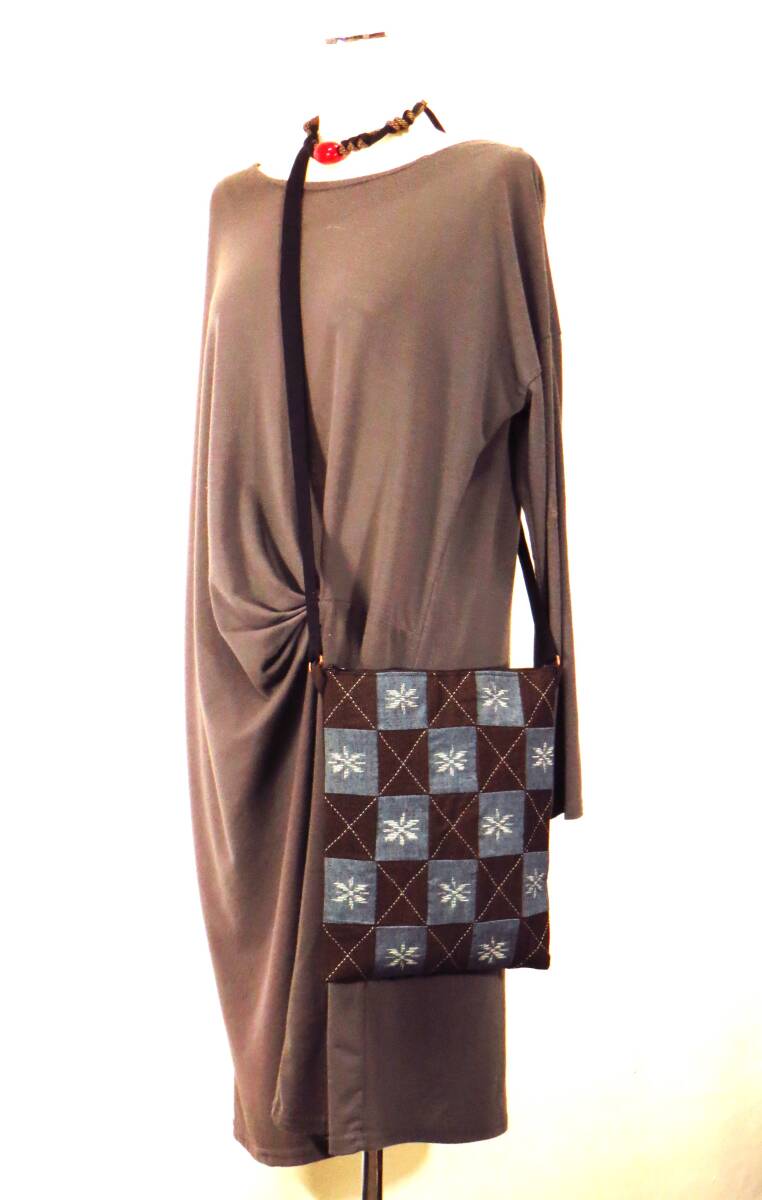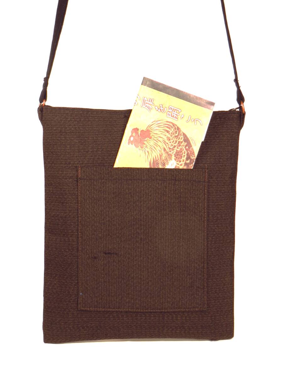 焦茶の着物地と藍絣を市松に接いだ、ショルダーバッグ。