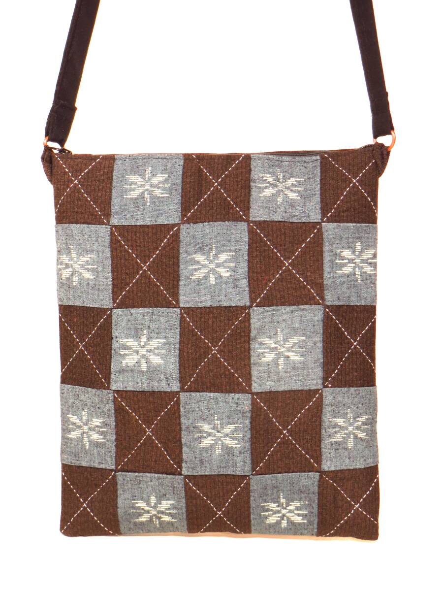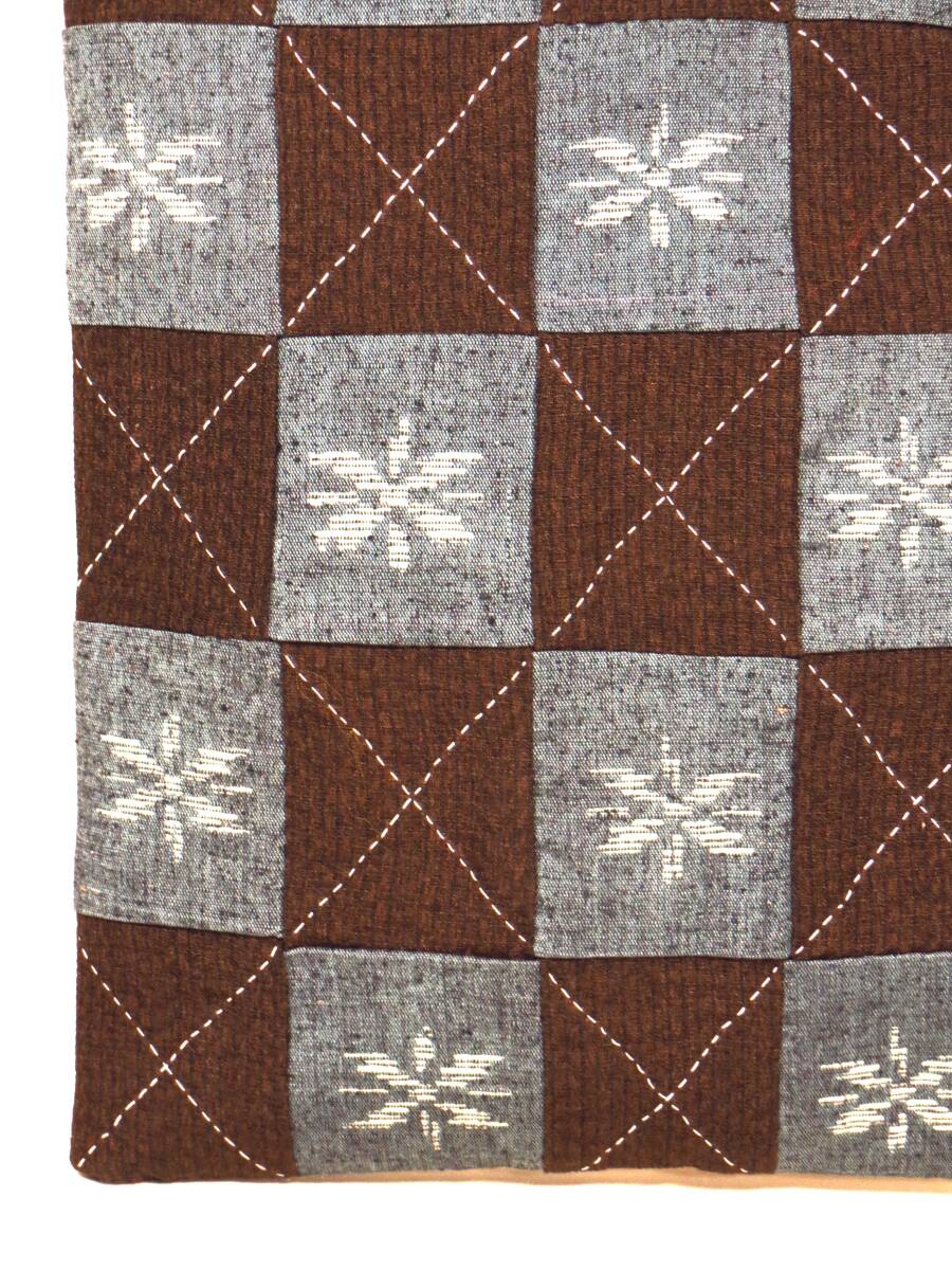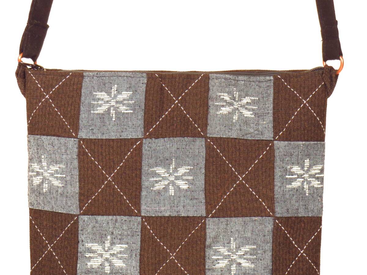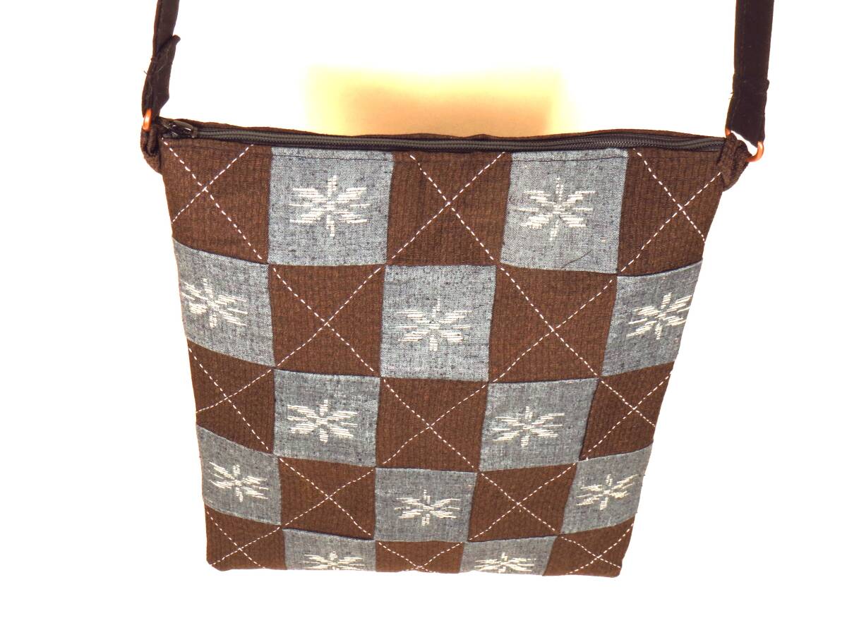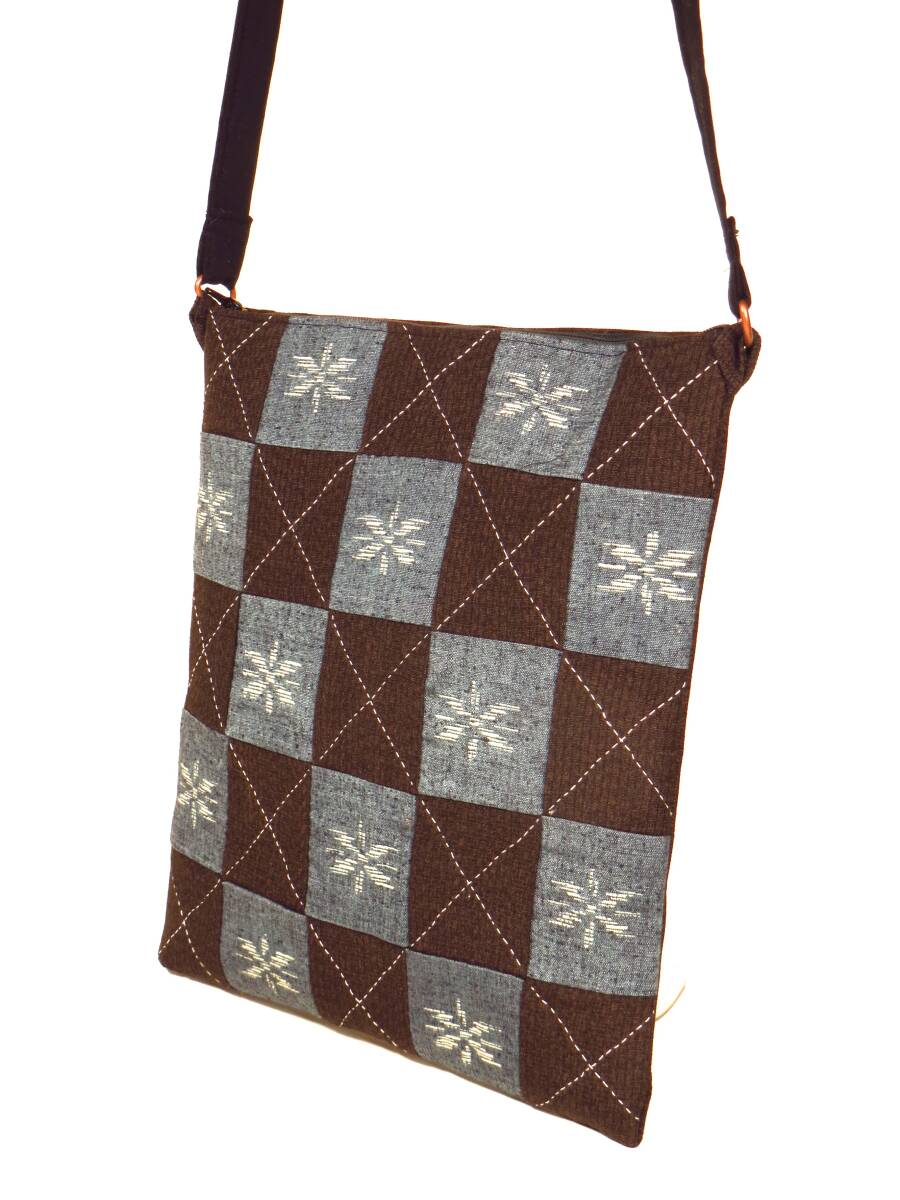 焦茶の着物地と藍絣を市松に接いだ、ショルダーバッグ。