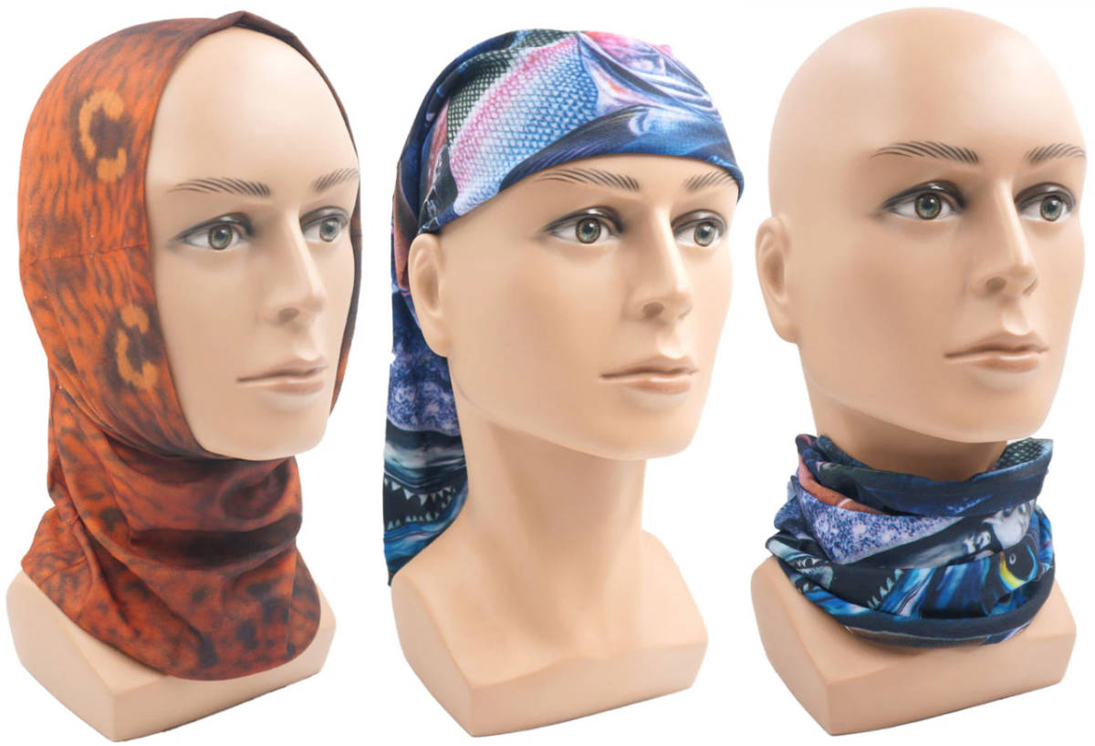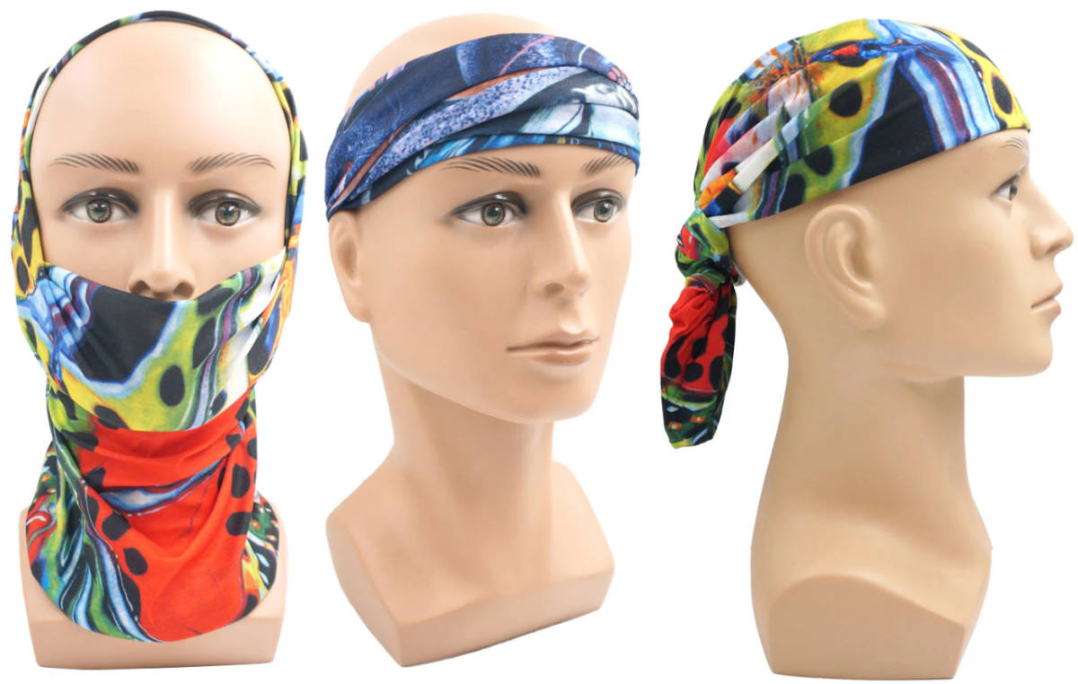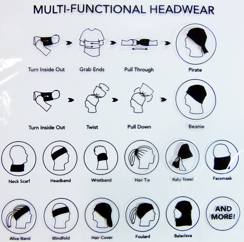 ウエストバンド、バンダナ、スカーフ、ハンカチ、帽子のように(12-in-1)とマルチに使えるようです。