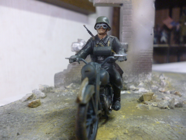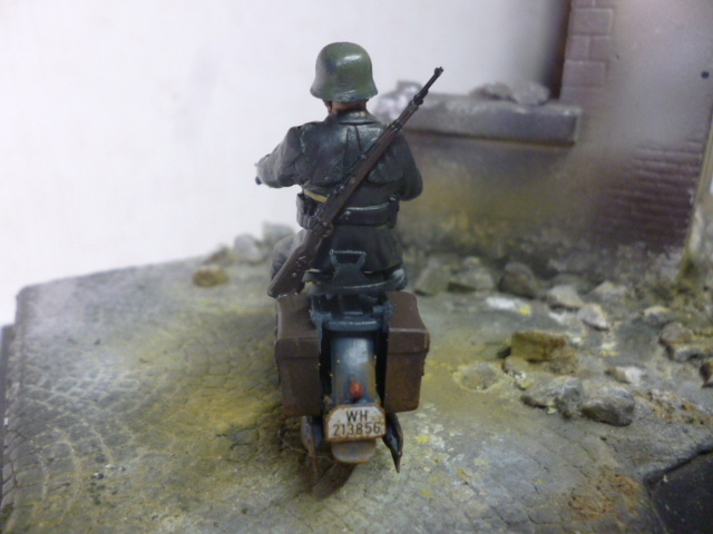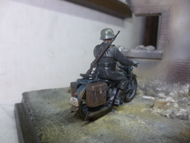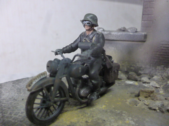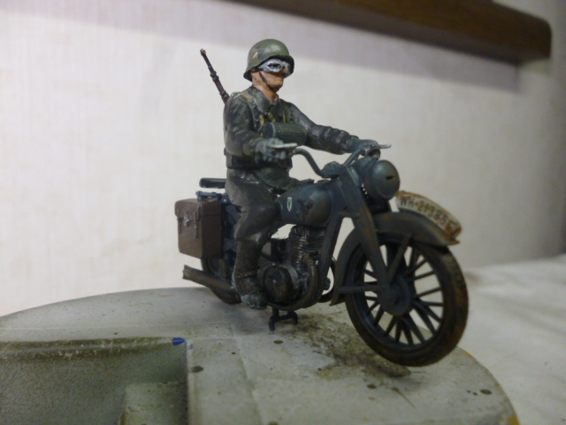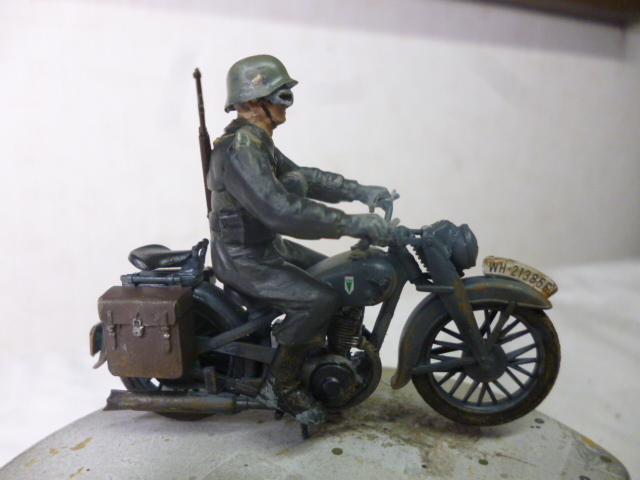 商品説明 | タミヤ製の1/35ドイツDKW NZ350オートバイ国防軍仕様完成品です。 フィギュアはゴム引きコート着用しているので、半光沢のダークグリーの刷毛塗りでバイクに固定はしていません。 下のベースと後ろの建物は付いていませんので御承知下さい。 バイクの塗装は下地処理してからのエアーブラシでのジャーマングレ単色でウエザリングもして有ります。 | |