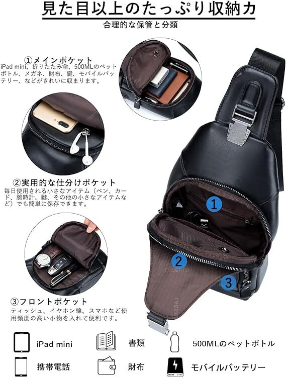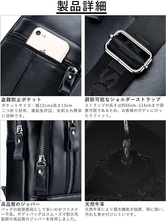 柔軟防水 ボディーバッグ ブラック ショルダーバッグ スポーツバッグ 防水 軽量 多機能 コンパクト 通勤 バイク お洒落 高級 本革 バッグ7