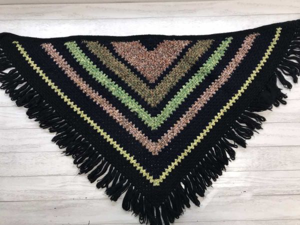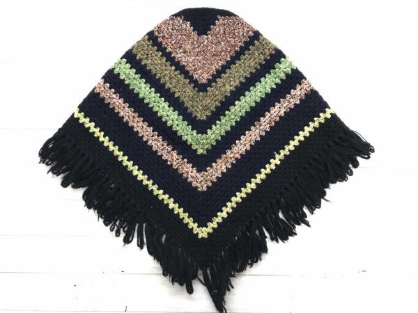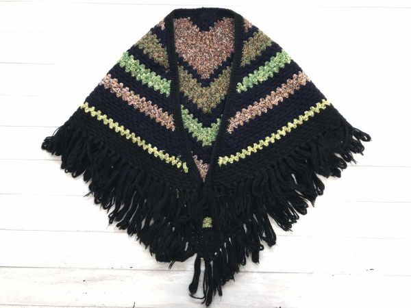 レトロ ボヘミアン カントリー 民族エスニック ネイティブ フリンジ ボーダー 模様編み ジャガードニット ポンチョ 羽織り レディース 黒 です。