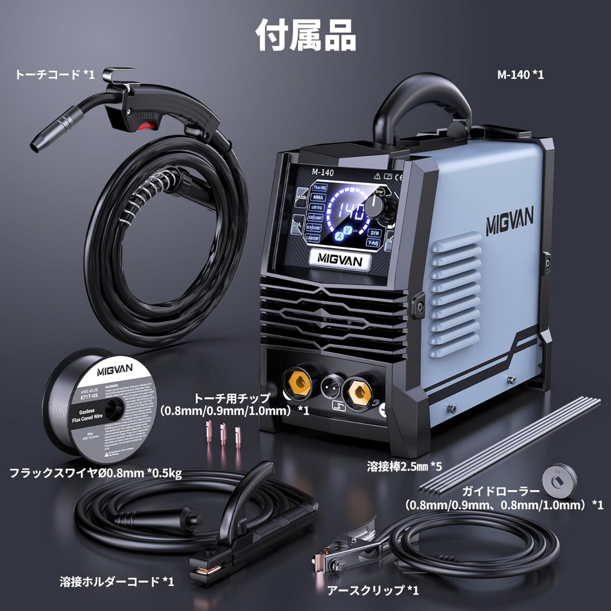 MIGVAN 半自動溶接機 100V 140A ノンガスMIG アーク溶接 LIFT TIG 1台3役 初心者向け インバーター搭載 電流 電圧調整可能 家庭用 小型軽量 MIG溶接機 定格使用率60% LED液晶表示 日本語取扱説明書付き