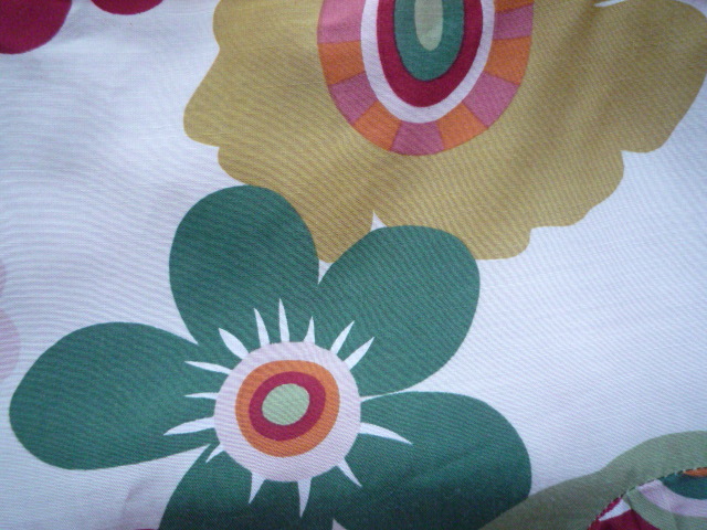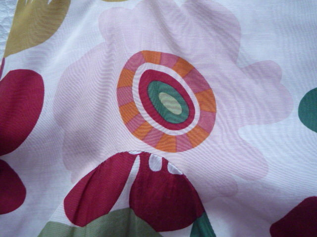 お色は、淡~いベージュ地に、暗めの赤・からし・くすんだオレンジ・ くすんだピンク・白・みどり・抹茶の大き目のお花柄プリントです。