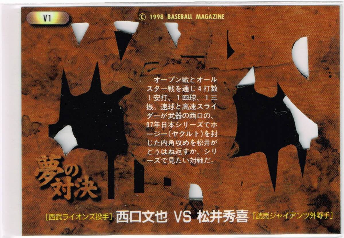 1998 BBM ベースボールカード 夢の対決 #V1 西武ライオンズ 西口文也/読売ジャイアンツ 松井秀喜 巨人 です。 サイズは89mm × 63mmです。 カードはスリーブ、またはトップローダーに入れて保管しております。。一般的な常識の範囲内で保管しておりますが、初期傷や経年による自然劣化などはご容赦ください。過度に状態を気にされる方は入札をご遠慮ください。 当方、喫煙者はおりません。 その他、何かご質問がございましたらお問合わせください。 | |