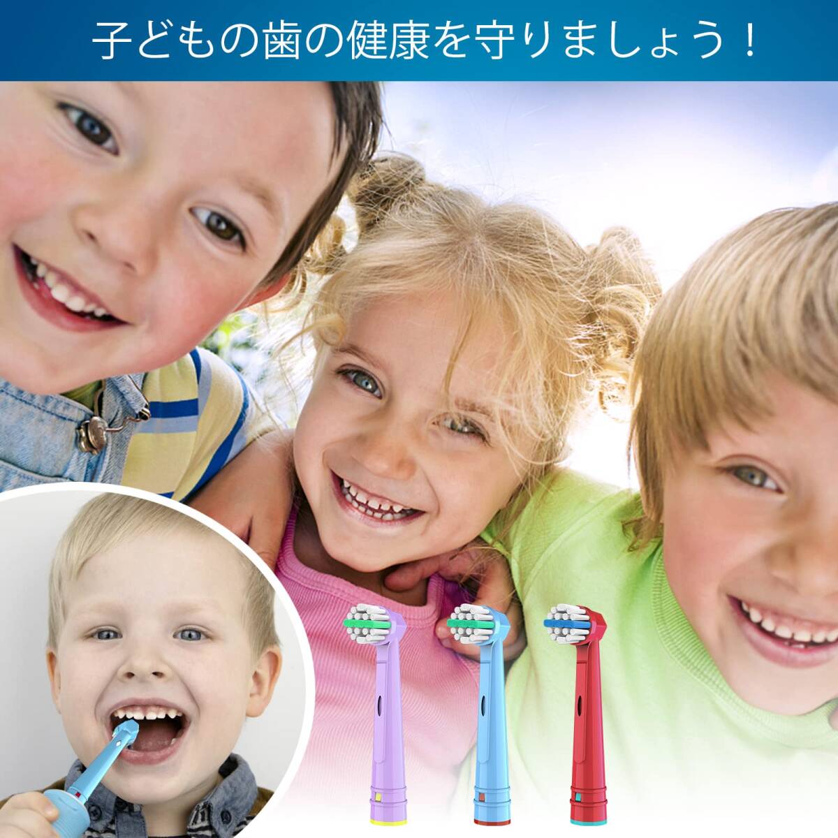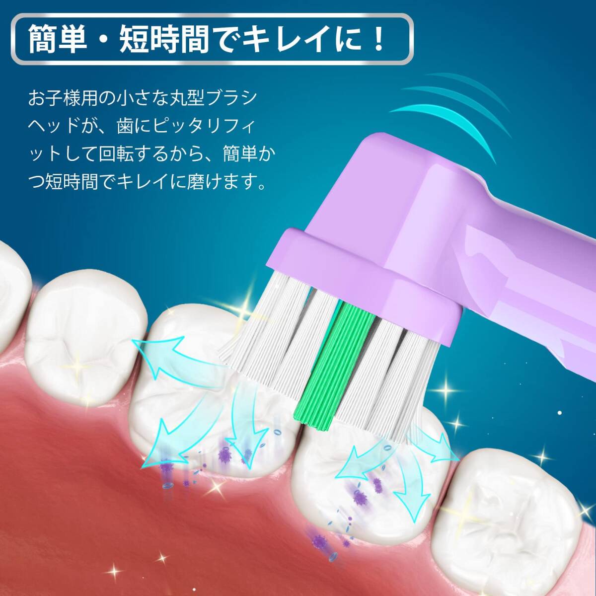 [子供・キッズ デザイン]:小さな丸型ブラシヘッドが子供の口の大きさにピッタリフィットして回転するから、簡単かつ短時間でキレイに磨けます。歯や歯ぐきを傷つけないよう、やわらかな極細毛を使用しています。子供の手に持ちやすくデザインされているので正しいブラッシング習慣を身に付けるのに役立ちます。お口の小さな方も使用可能です。※3歳からでも安全にご使用いただけます。使用する際は、子供の近くでブラッシングを見てあげてください
