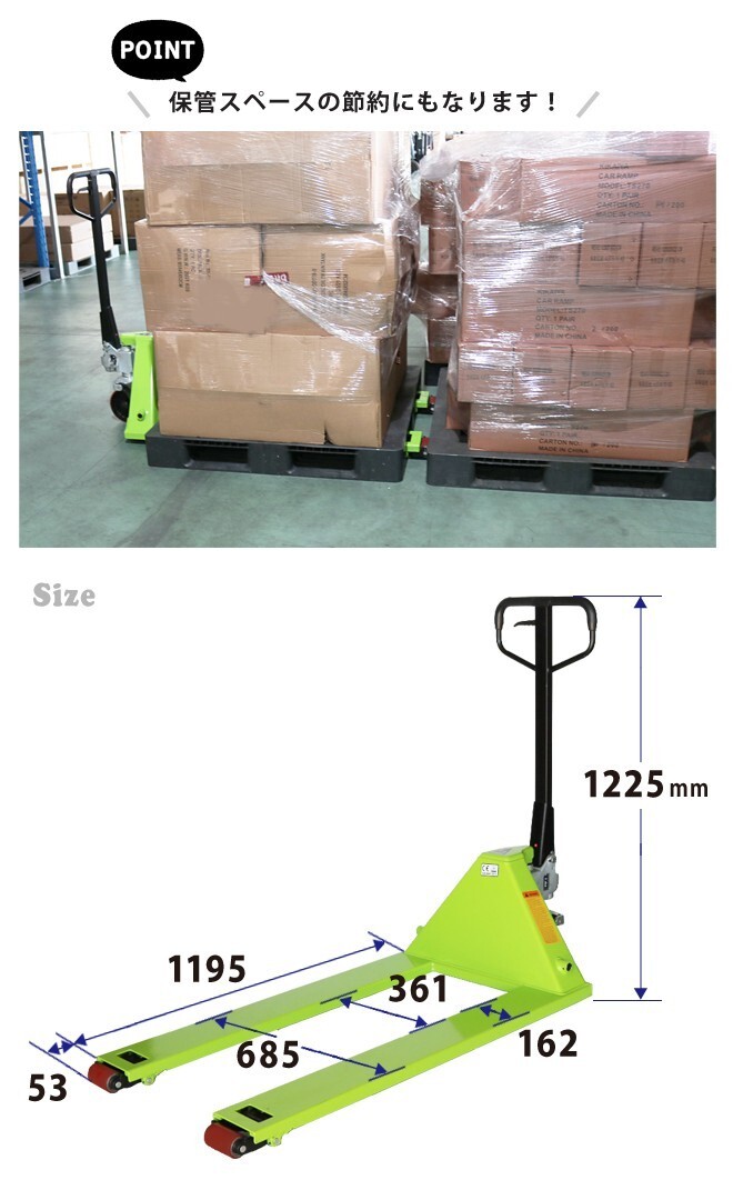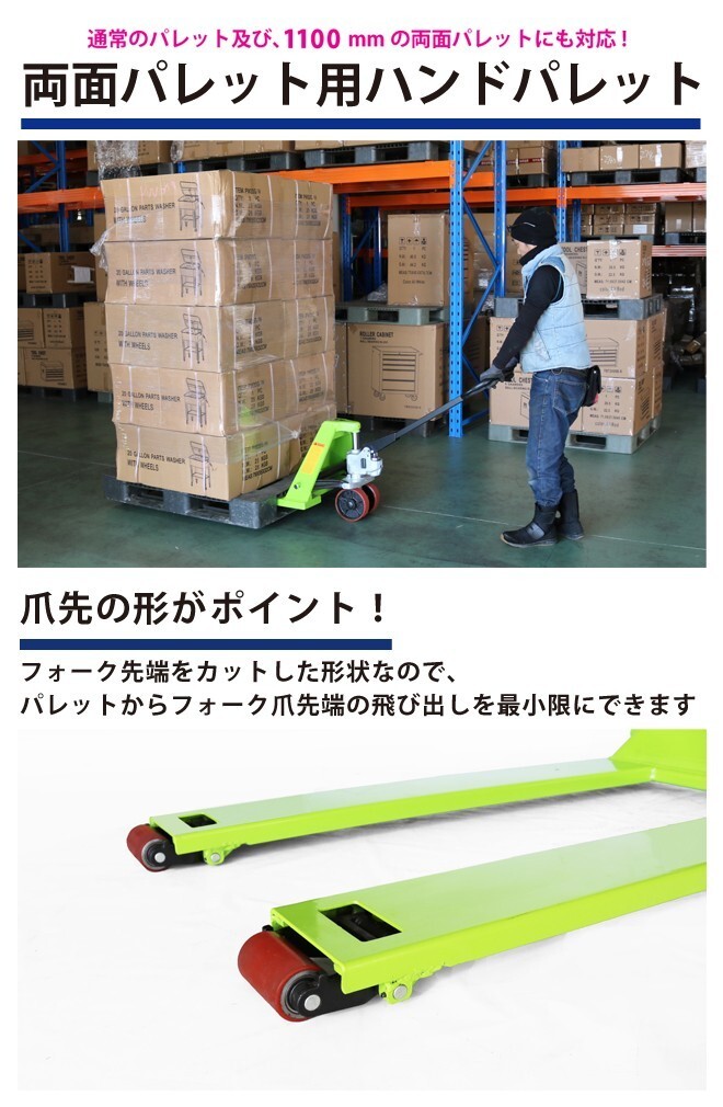●通常のパレット及び、1100mmの両面パレットにも対応したハンドパレットです ●フォーク先端をカットした形状なので、 パレットからフォーク爪先端の飛び出しを最小限にできます ●両面パレットの敷きつめや壁寄せなど、 前方ローラーのスペース分まで寄せて行えます ●フォーク幅が685mmと幅広なので、安定感があります ●低床65mmでさまざまパレットの移動や作業に対応します ●ステアリング/フォークローラーともポリウレタン巻きで、 床にも優しく、傷付きの心配がありません ●ローラー軸は全てベアリング入りなので、移動もスムーズです ●ステアリングローラーは小回りが効き、楽に方向を変えられます ●下降用フットペダルがあります ●工業製品国際規格TUV/CEマーク取得の一級品です ●能力以上の荷物は上昇・下降させないで下さい 能力以上の荷重がかかると、安全弁が作動し本体を保護します |