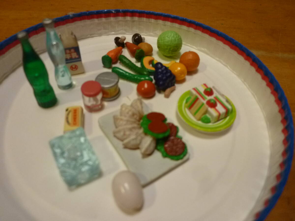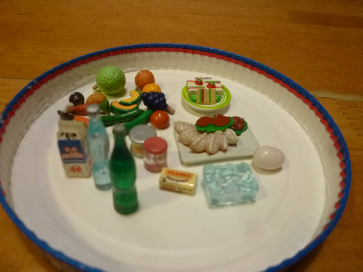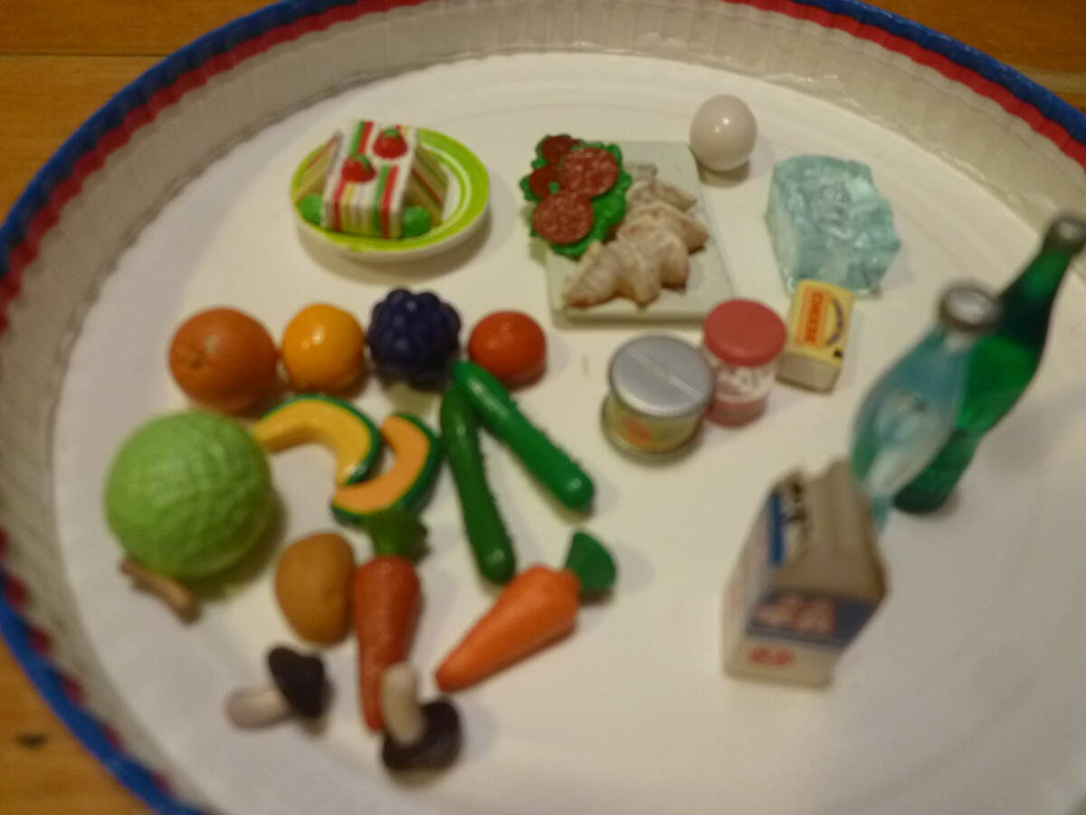 こちらは女の子が大好きなシルバニアファミリーの冷蔵庫用品等のセットになります。組み合わせ内容は当方の判断でとなり、氷やバター・ドリンク・ジャム・サンドイッチ・餃子等と野菜室用には沢山の野菜や果物等をセットにしてあります。