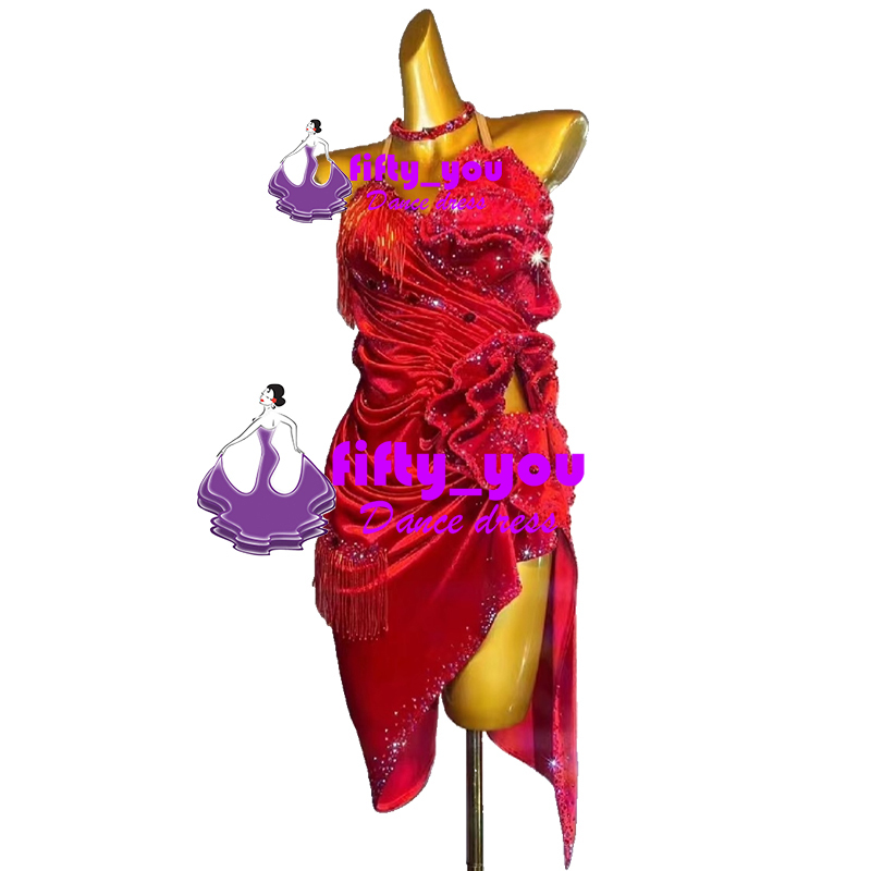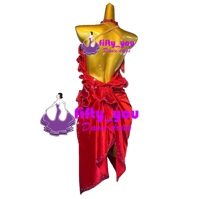 新品fifty_youレディース社交ダンス衣装 セミオーダー  試合競技ドレス  ラテン高級ドレス ベルベット素材 上品1着 赤色