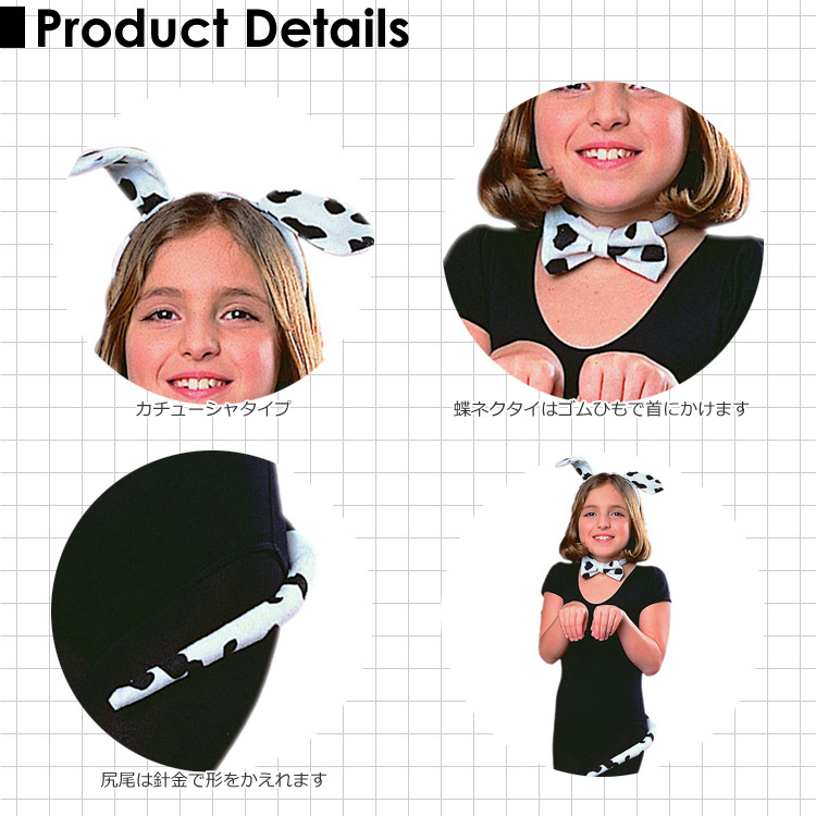 仕様 | 耳カチューシャ、ゴムの付いた蝶ネクタイ、尻尾をつけて可愛く変身! 簡単にコスプレできるアイテムです |