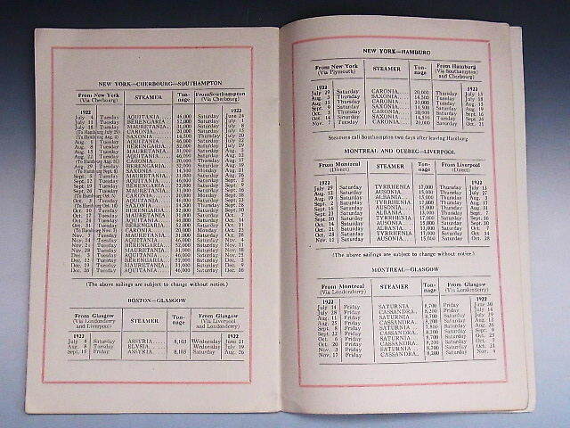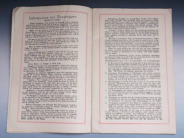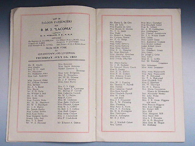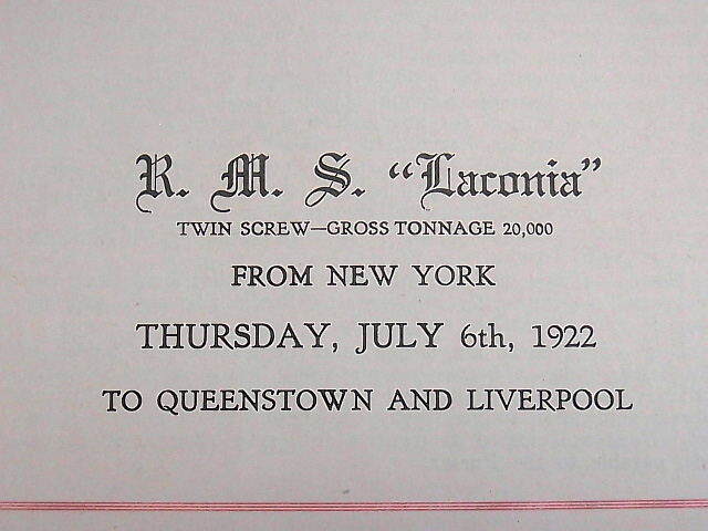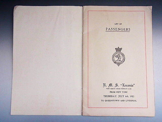 キュナード・ライン・ラコニア号 1922年 乗客リスト ◆ 紙もの収集 エフェメラ