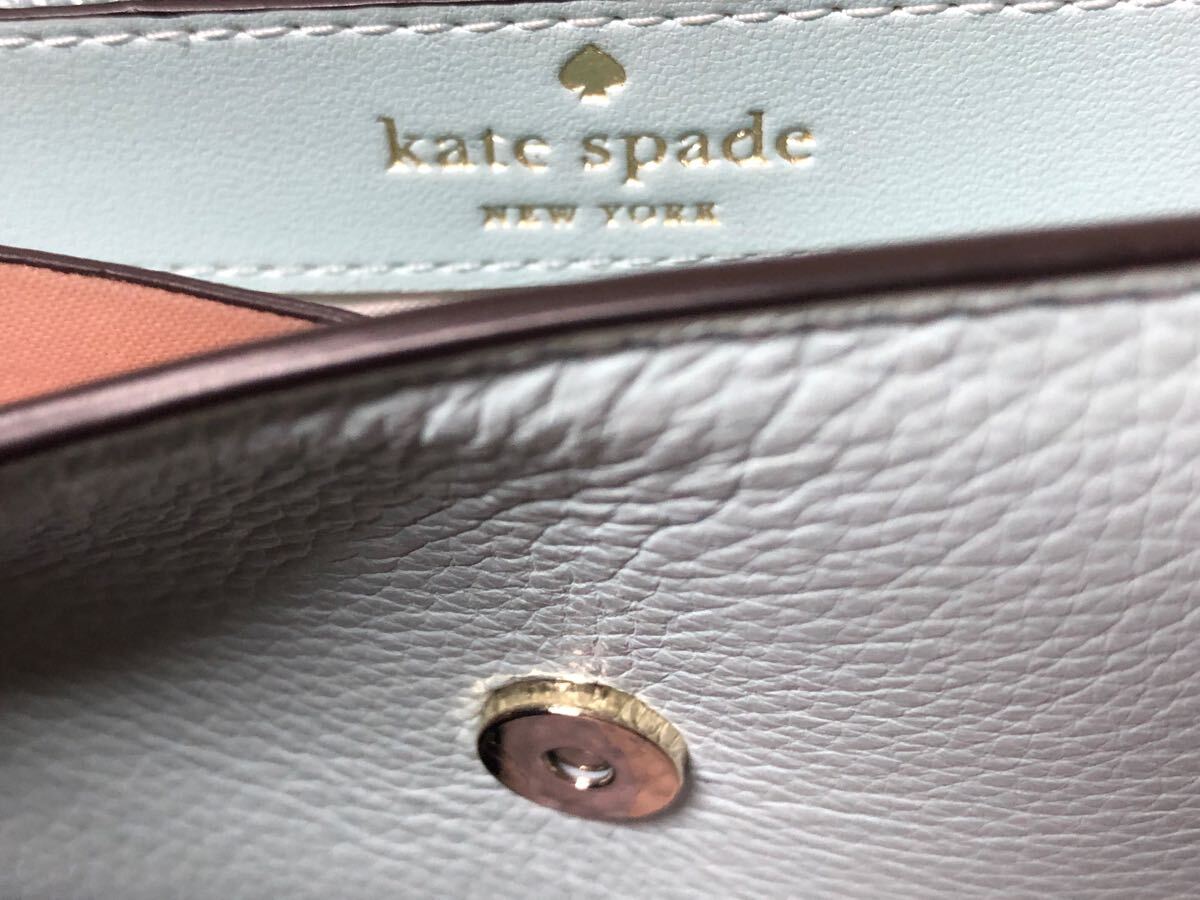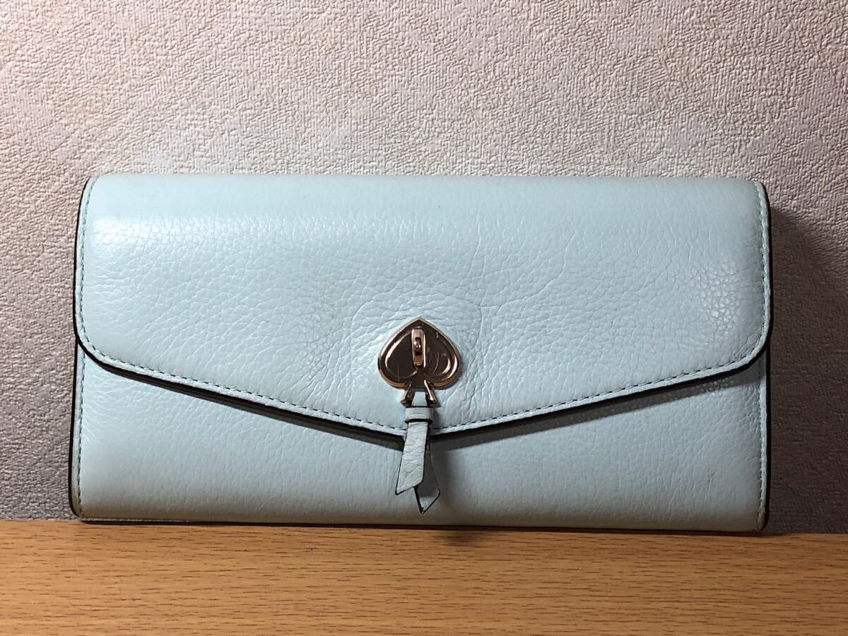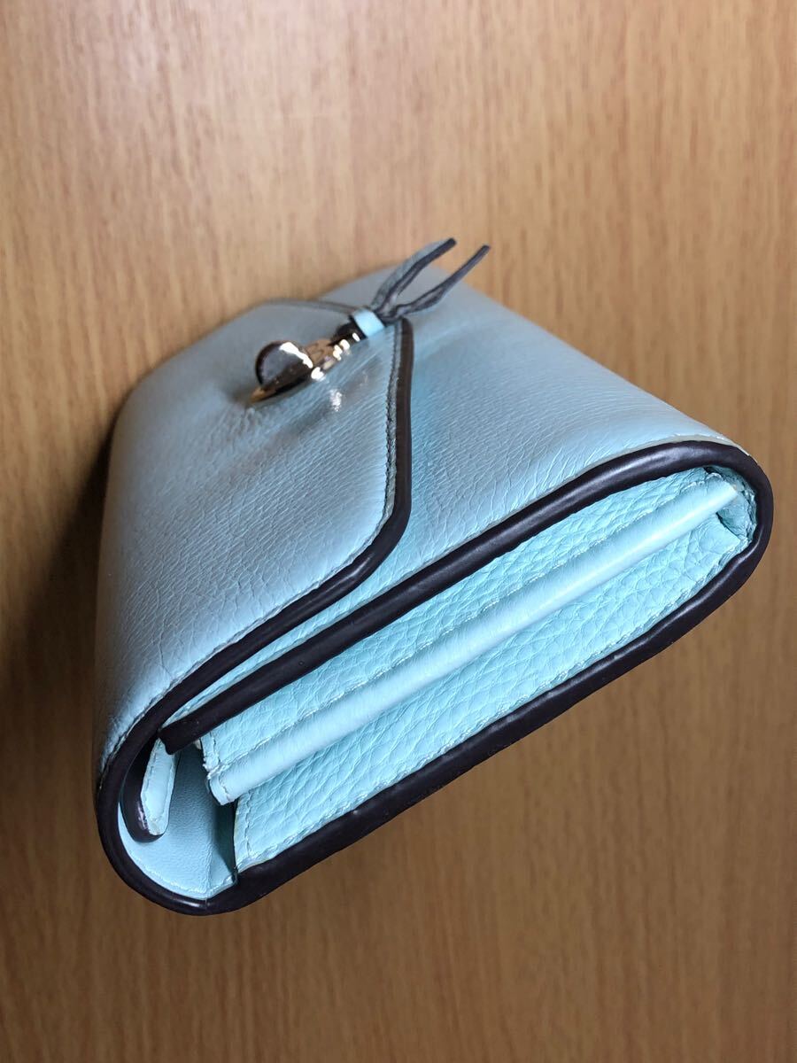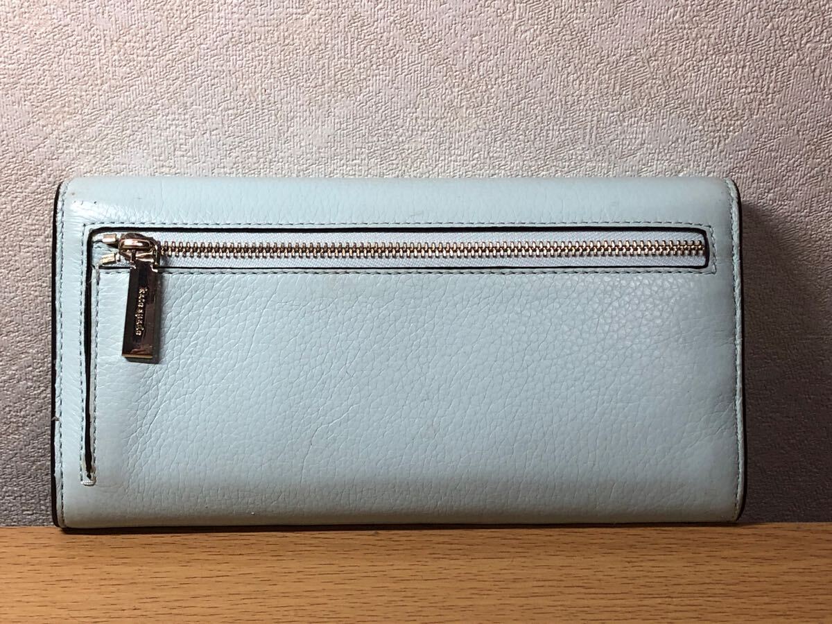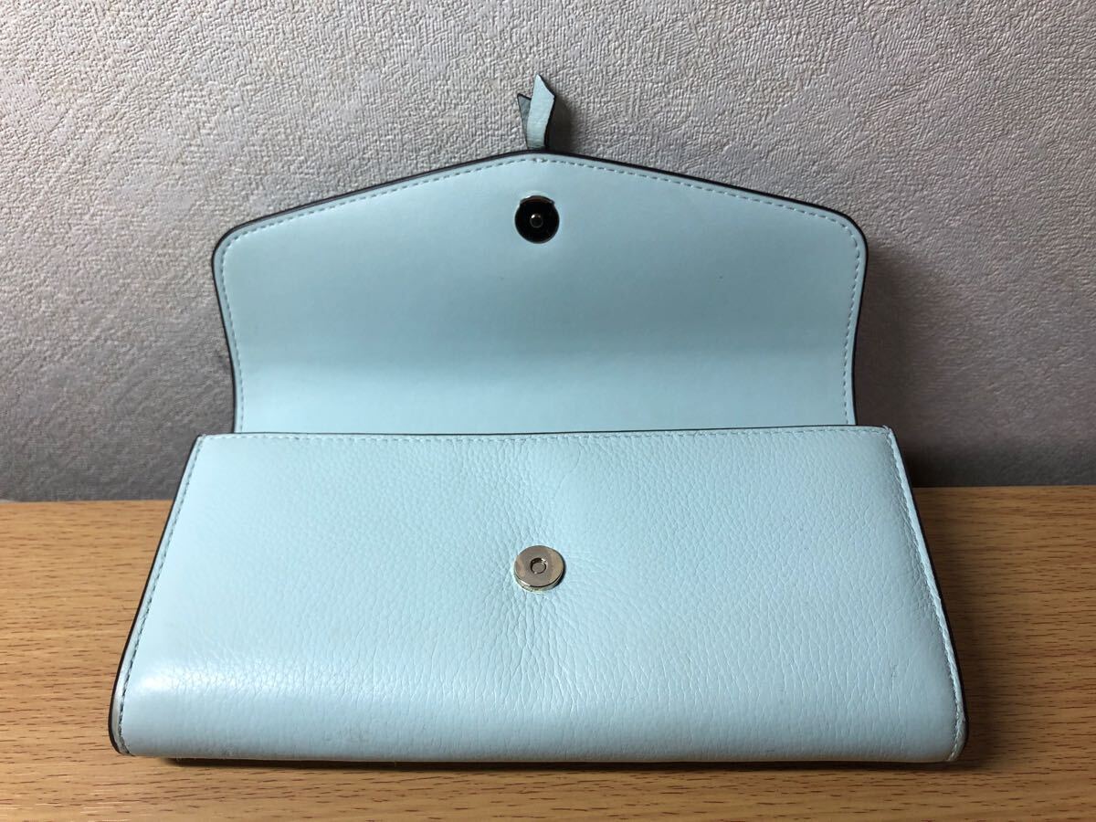 無地レザーにスペード金具×タイリボン付き、フラップ開閉長財布です。内部は間仕切りにもなるファスナー小銭入れ、カードポケット12か所などの収納ができます。