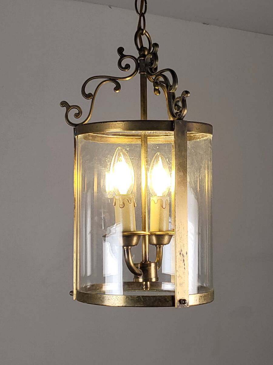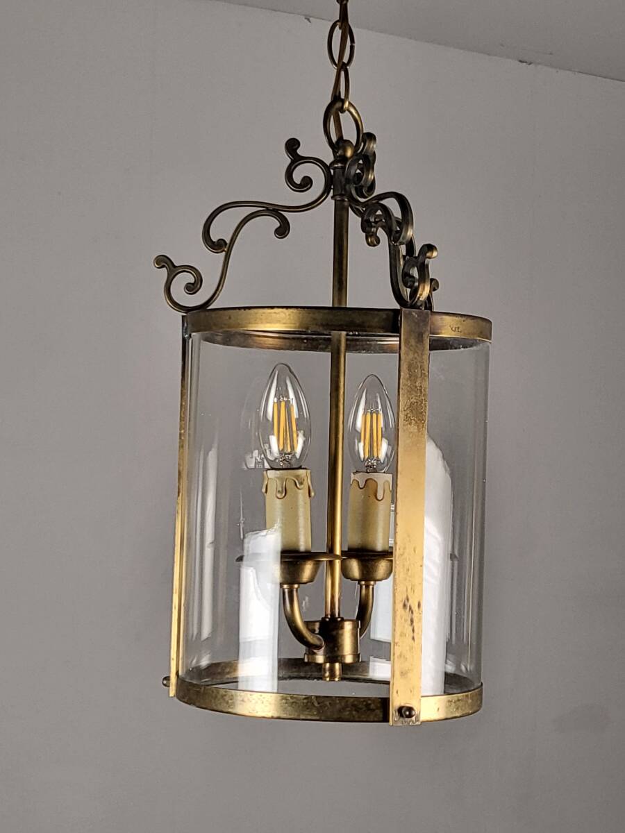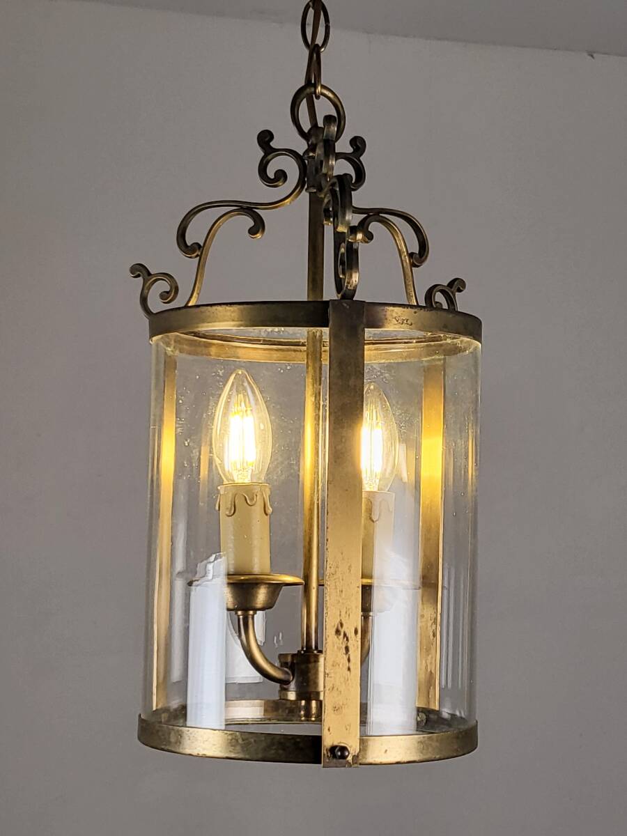 フランスアンティーク ヴィンテージ 吊り下げガラスランプ 2灯 高貴で上品なランプ  真鍮 玄関ランプ ショップディスプレー 店舗什器
