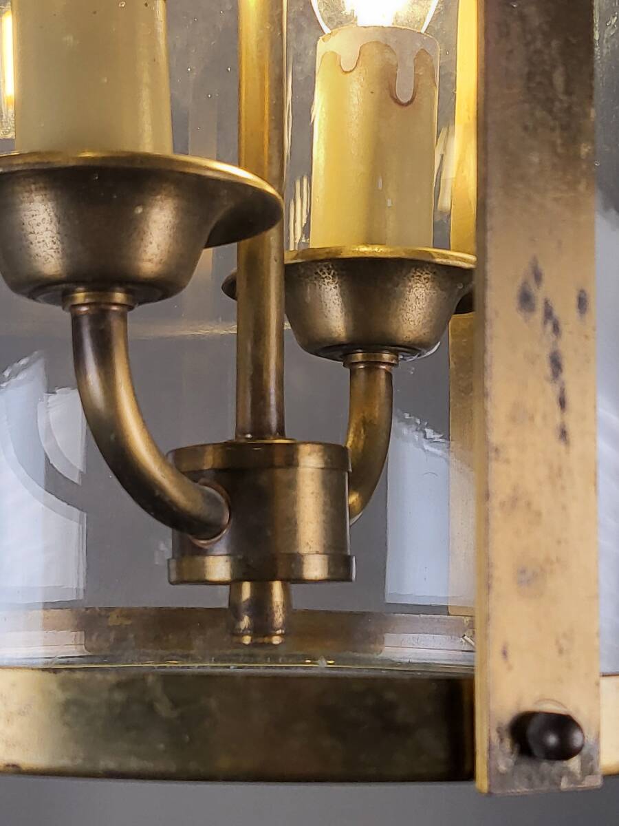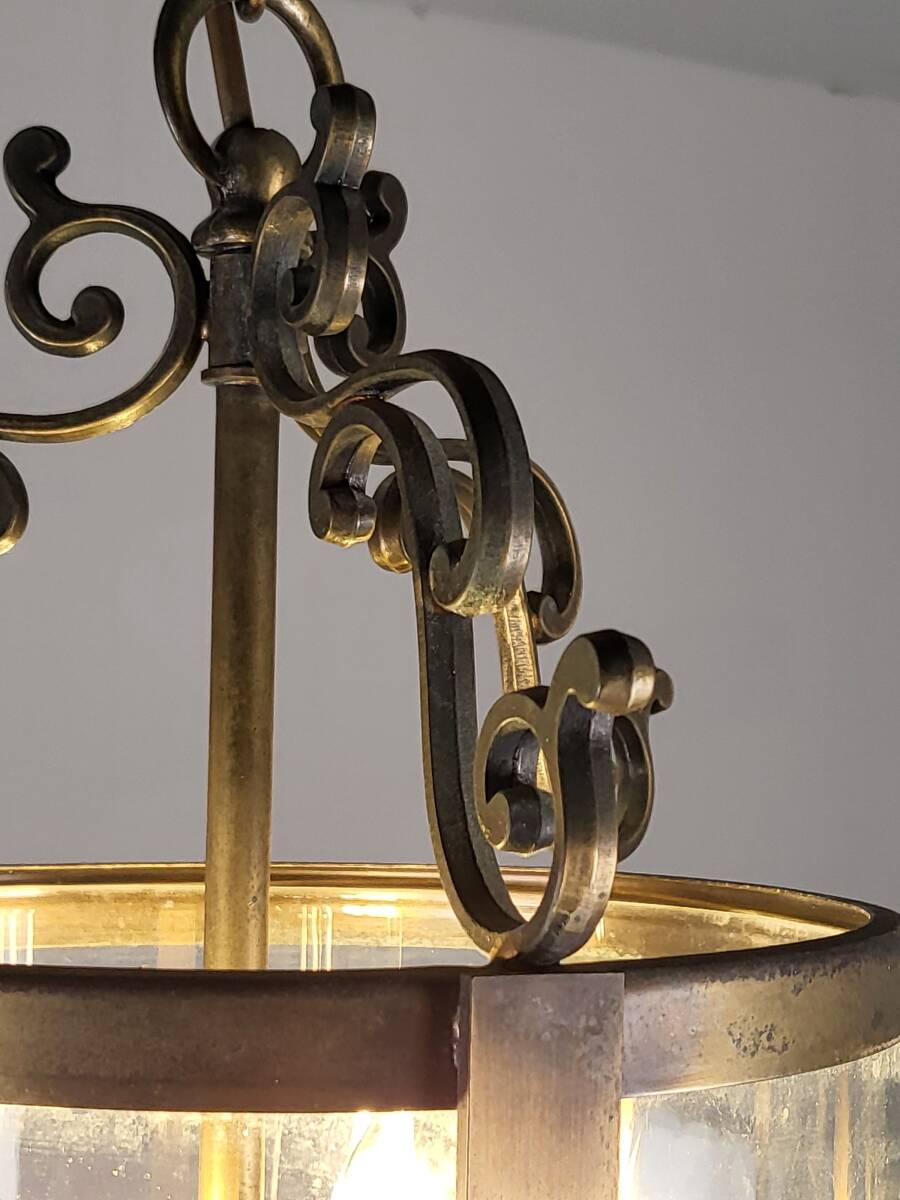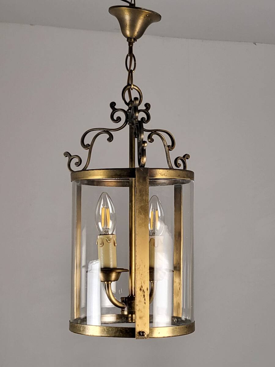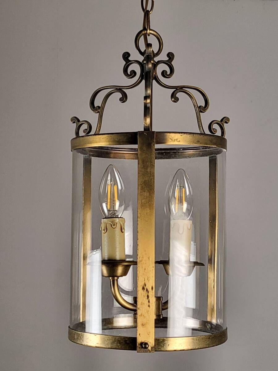 フランスアンティーク ヴィンテージ 吊り下げガラスランプ 2灯 高貴で上品なランプ  真鍮 玄関ランプ ショップディスプレー 店舗什器