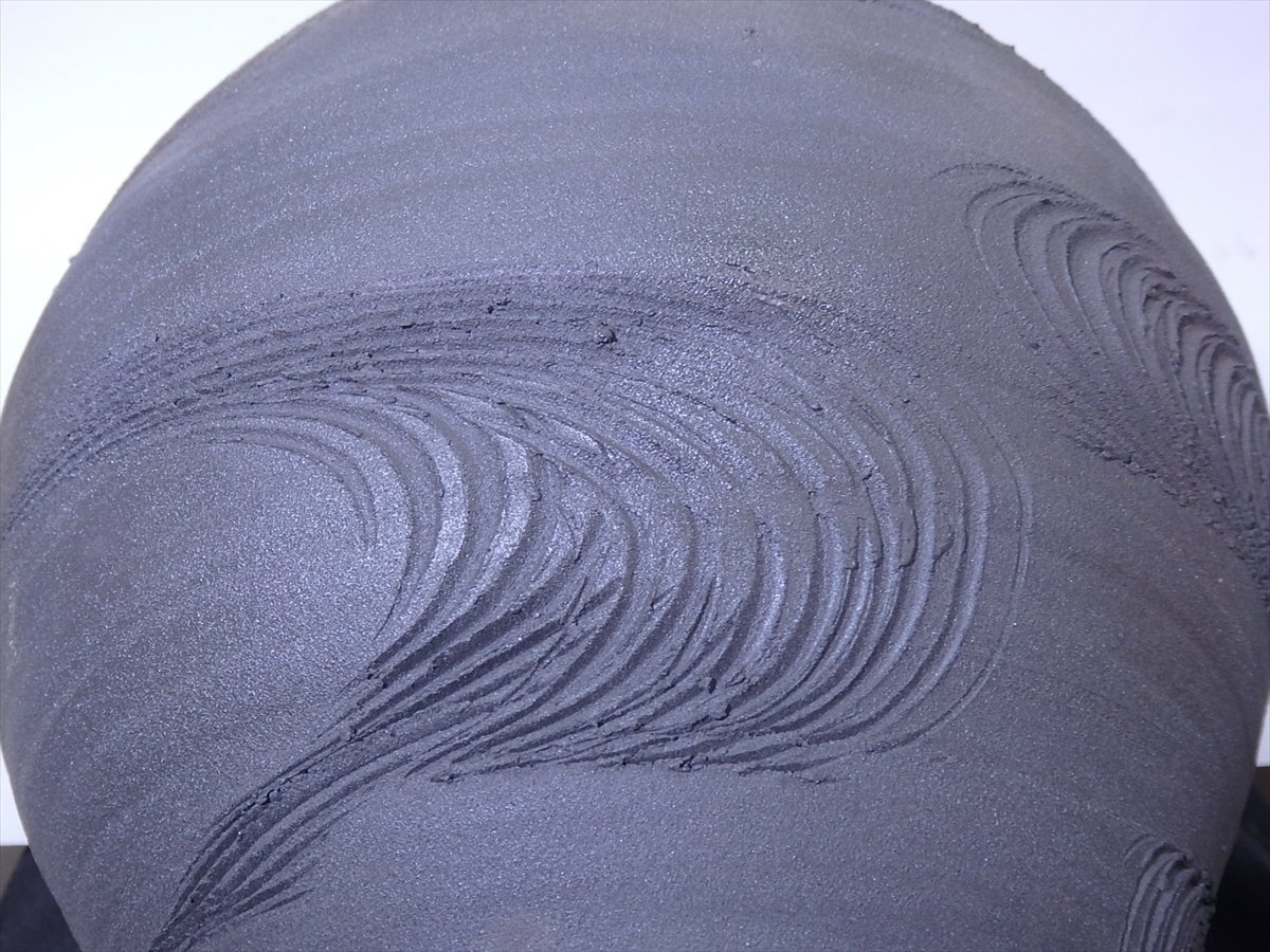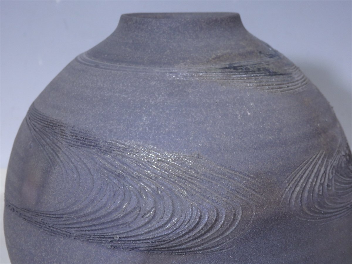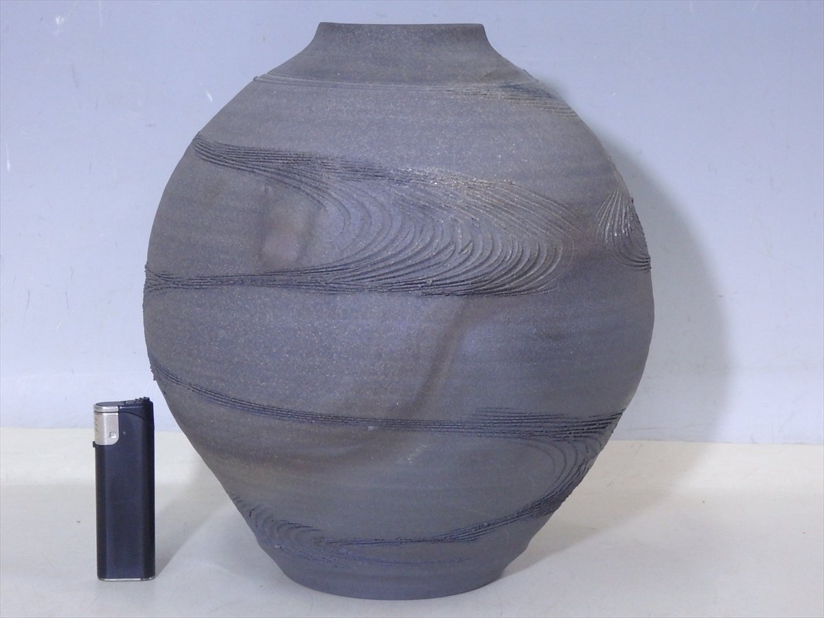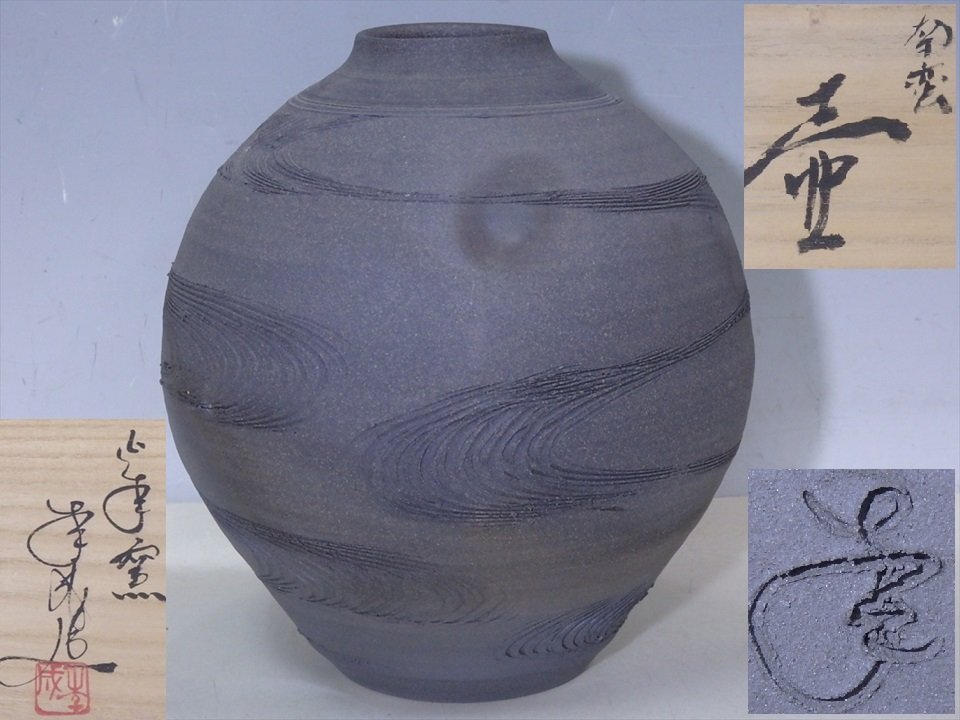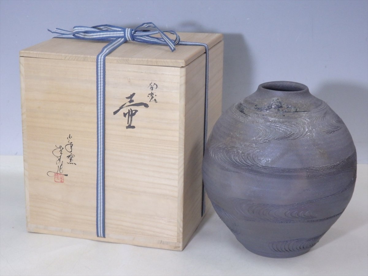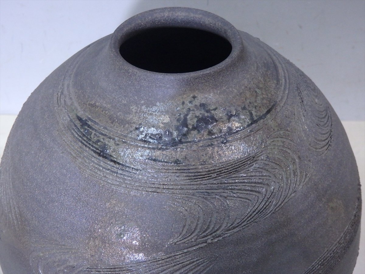 ★流水の彫り模様が美しい!丹波焼 延年窯 市野年成作【南蛮 壷 共箱】状態良好!胴径23cm 高さ25.5cm 口径6.1cm 置物 家具 セール!