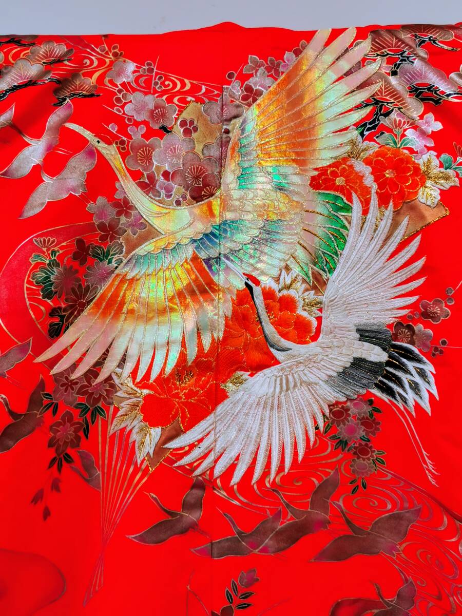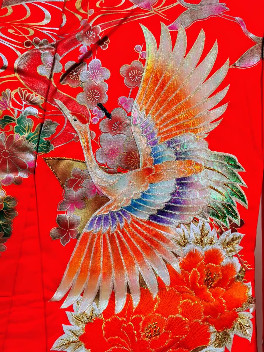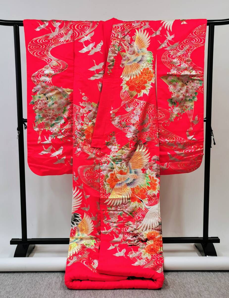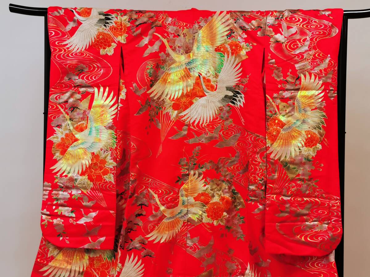 落ち着いた赤色の着物に、鶴や扇子の刺繍が施され、レインボーにきらめく豪華な色打掛です。