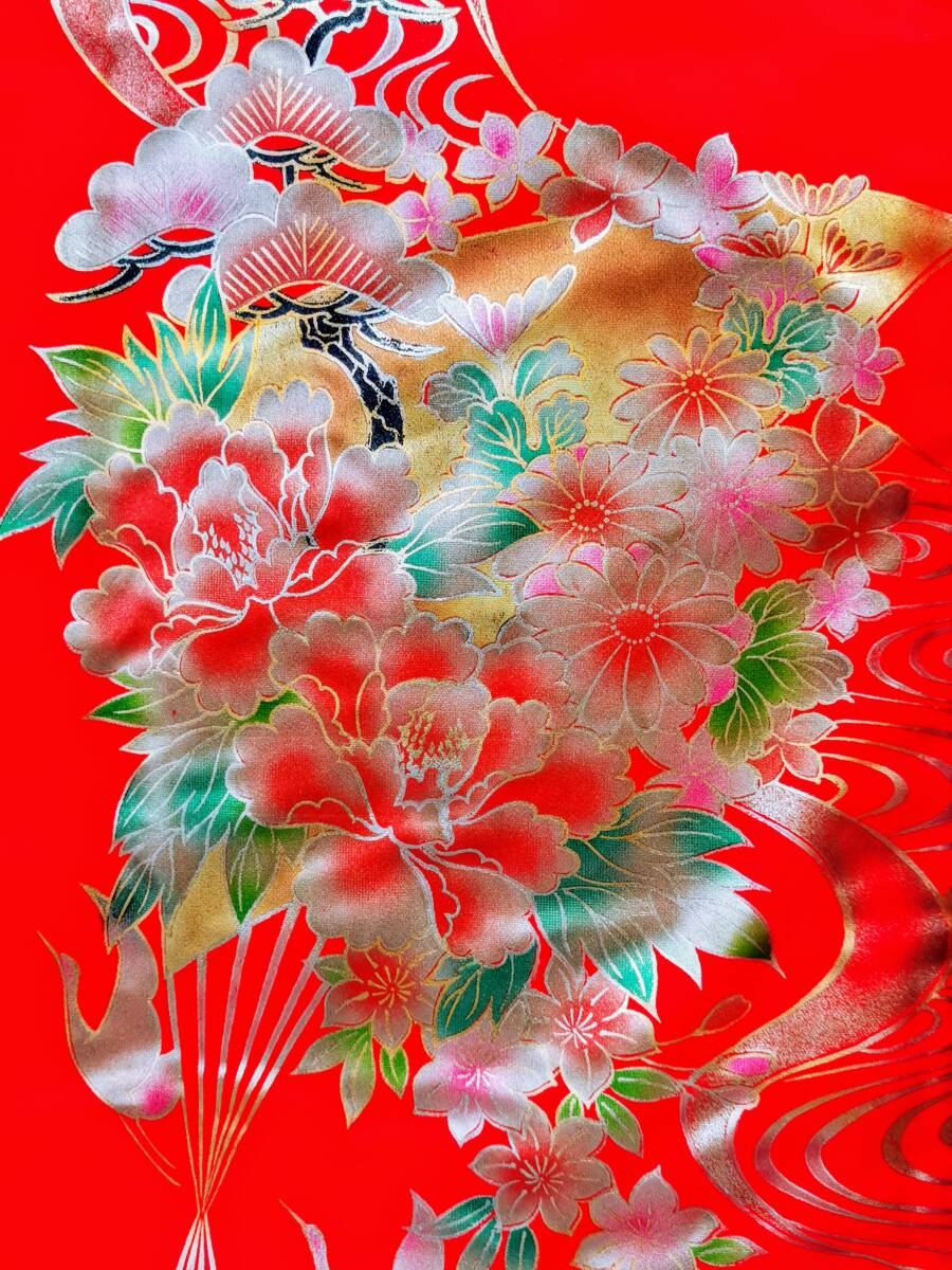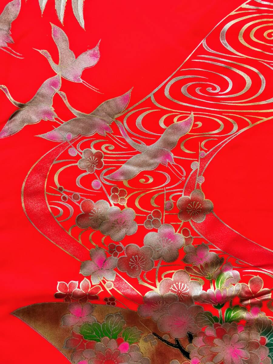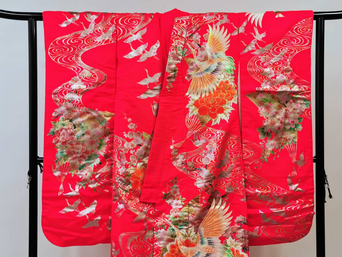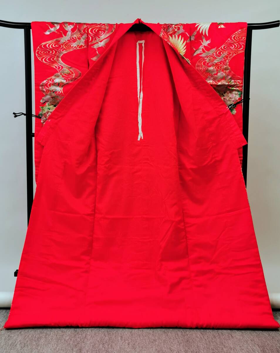 落ち着いた赤色の着物に、鶴や扇子の刺繍が施され、レインボーにきらめく豪華な色打掛です。