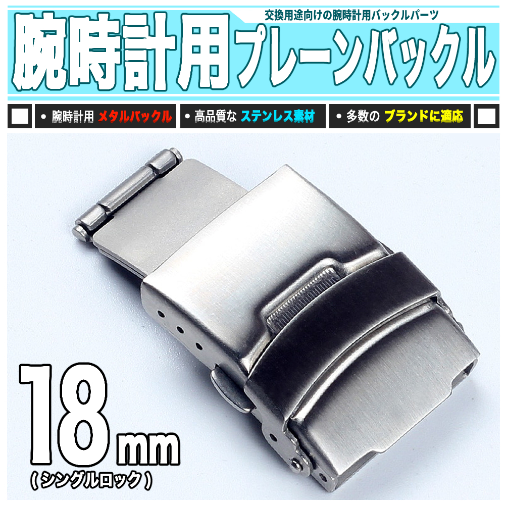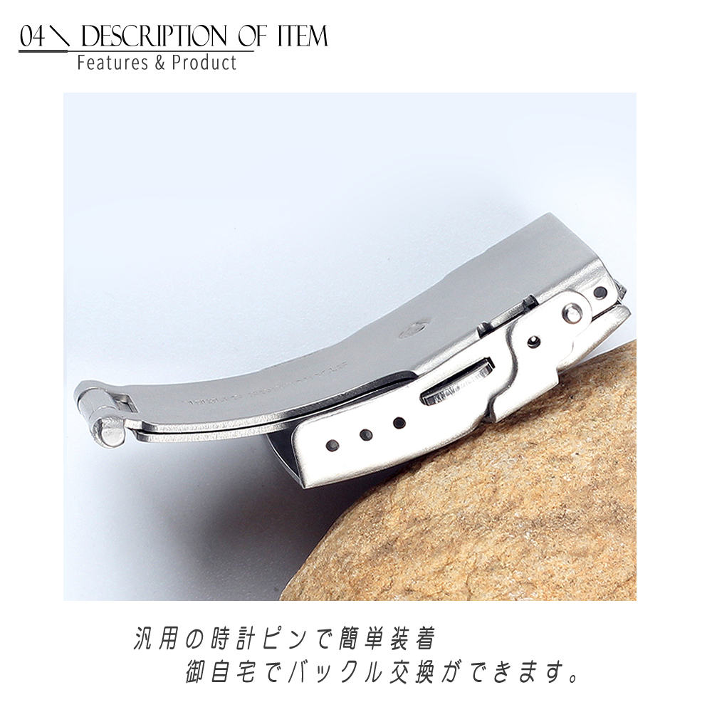 棒ピンで腕時計バンドに接続する、 交換用のクラスプバックルです。 国内 / 国外の時計に対応しており プレーンな形状で非常に扱いやすいバックル。 バックル本体にはヘアライン加工で 美しい金属質感を実現。 時計着脱はボタン式で開閉が行いやすく、 扱いやすいバックルロックを搭載。 傷ついたバックルの交換にも最適な。 シンプルな腕時計バックルになります。 |