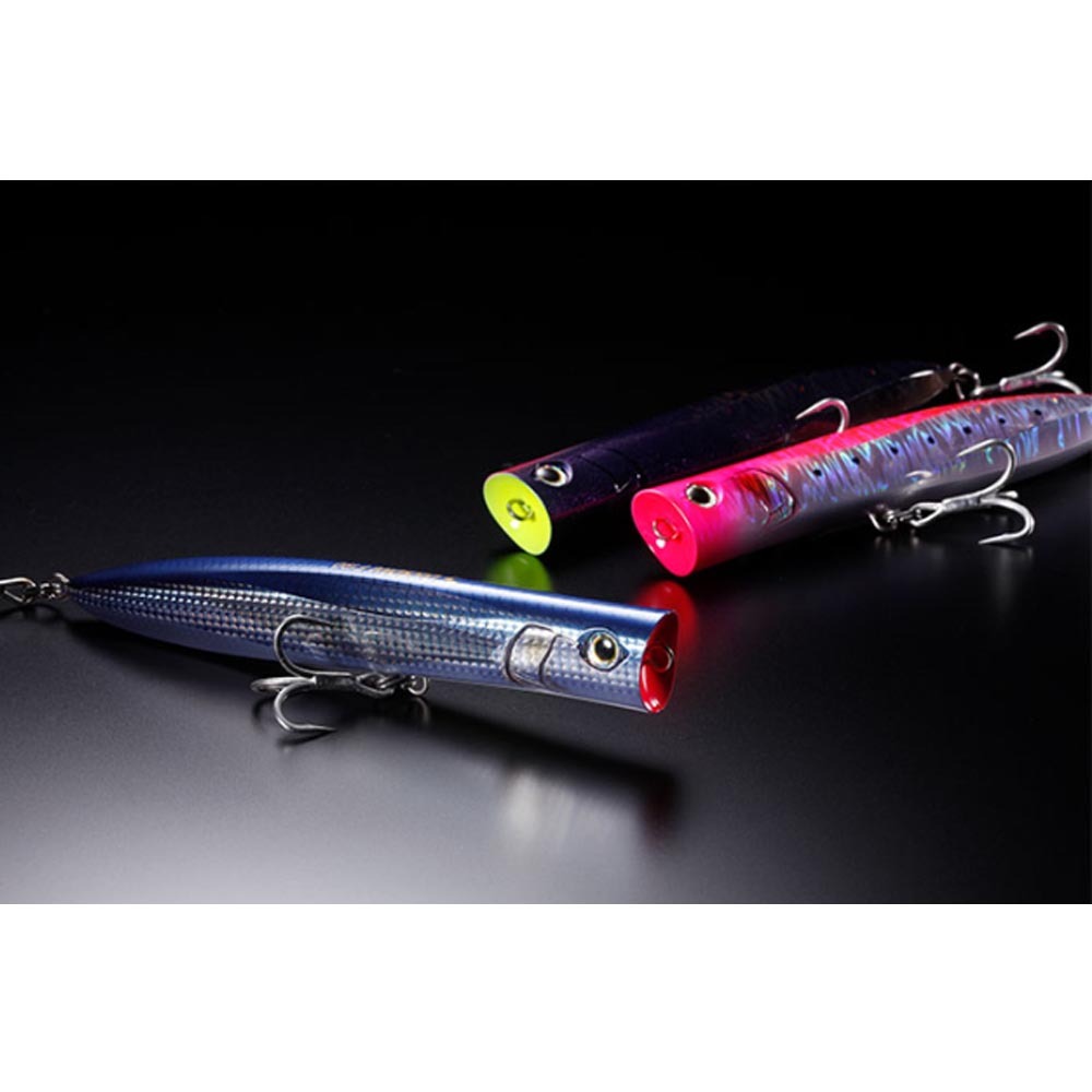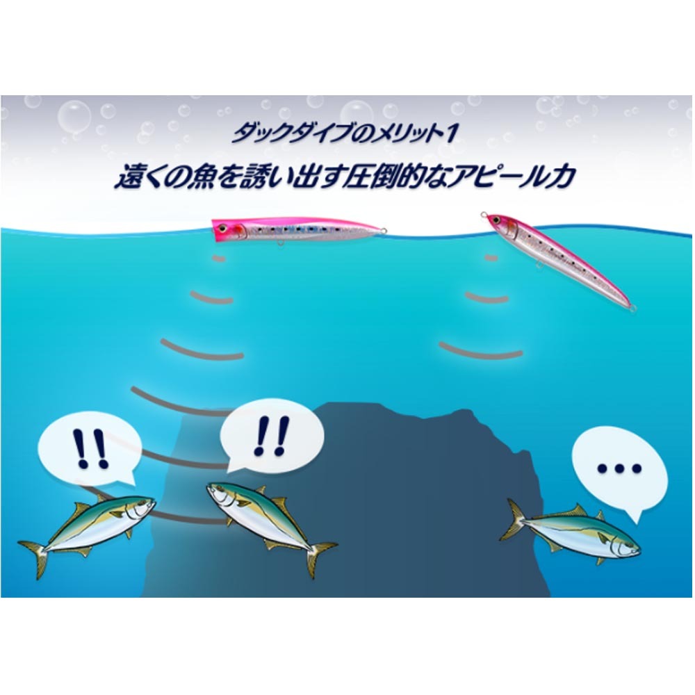 ダイビングペンシルの水押し(波動)は、接近戦では食わせの最後の一押しとなるが、広範囲へのアピールは弱い。一方、ポッパー特有の泡音(バブリング音)は水中で減衰し難く、ルアーが死角になるような位置に定位する魚や、より広範囲の魚に対しルアーの存在を認識させ、捕食へと駆り立てることができる。