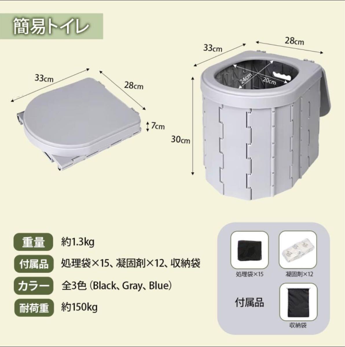 簡易トイレ:33×30×28cm / 耐荷重150kg / 重量1.3kg / 凝固剤・処理袋12回分付き