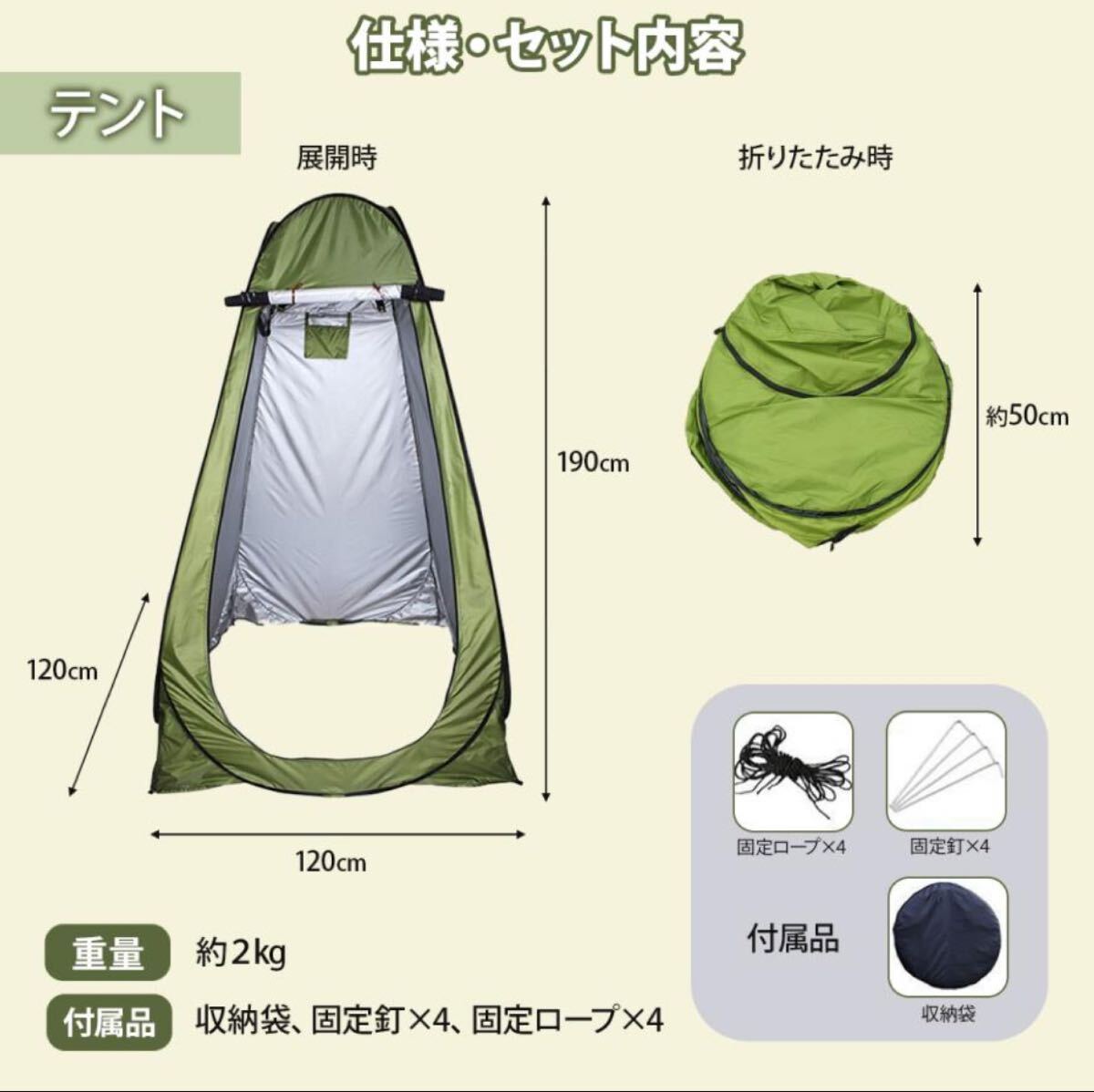 トイレテント:展開サイズ 120×120×190cm / 耐水圧 1500mm / 重量 約2.5kg