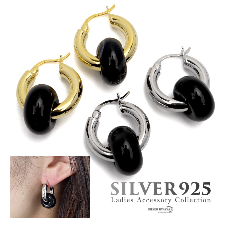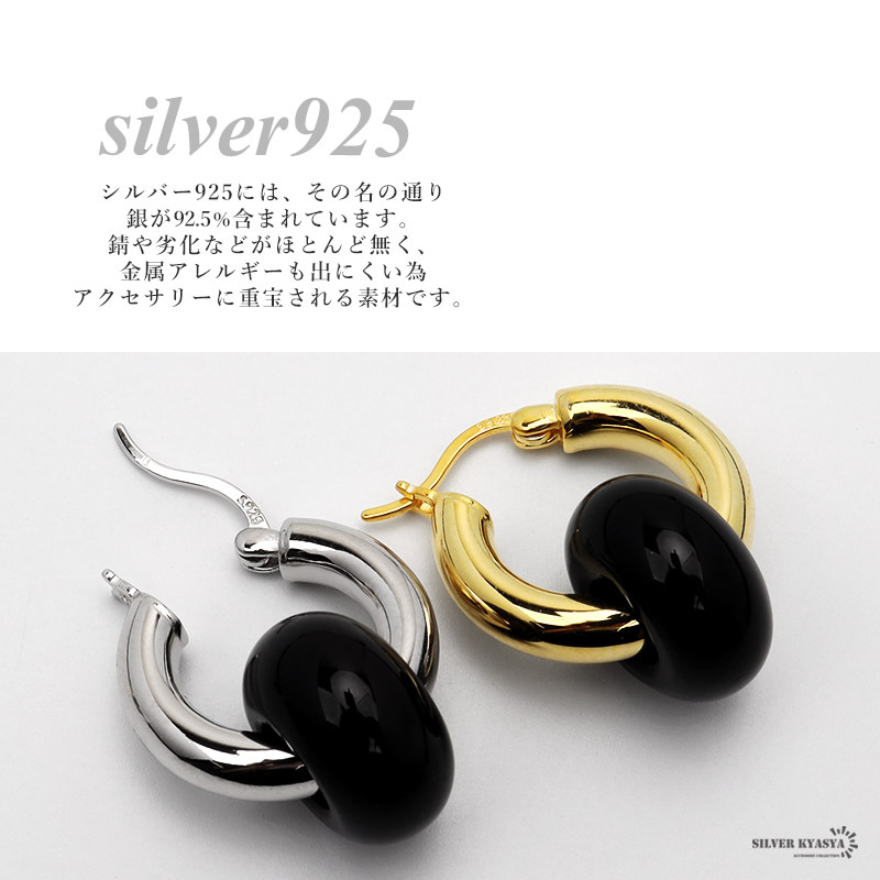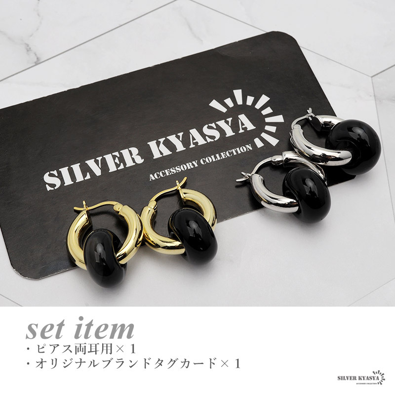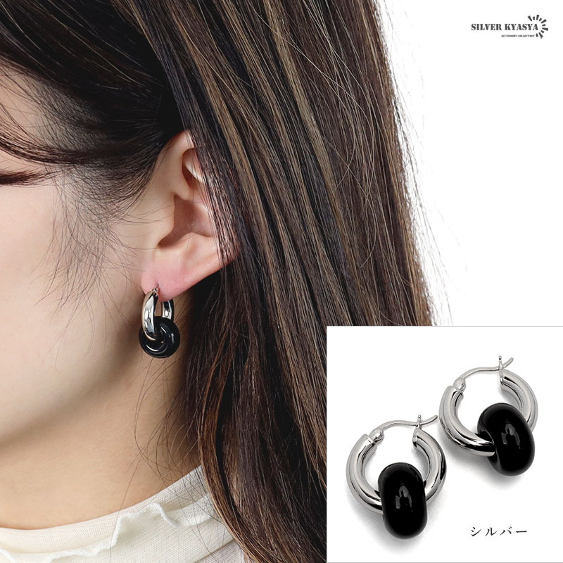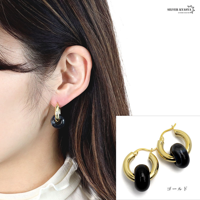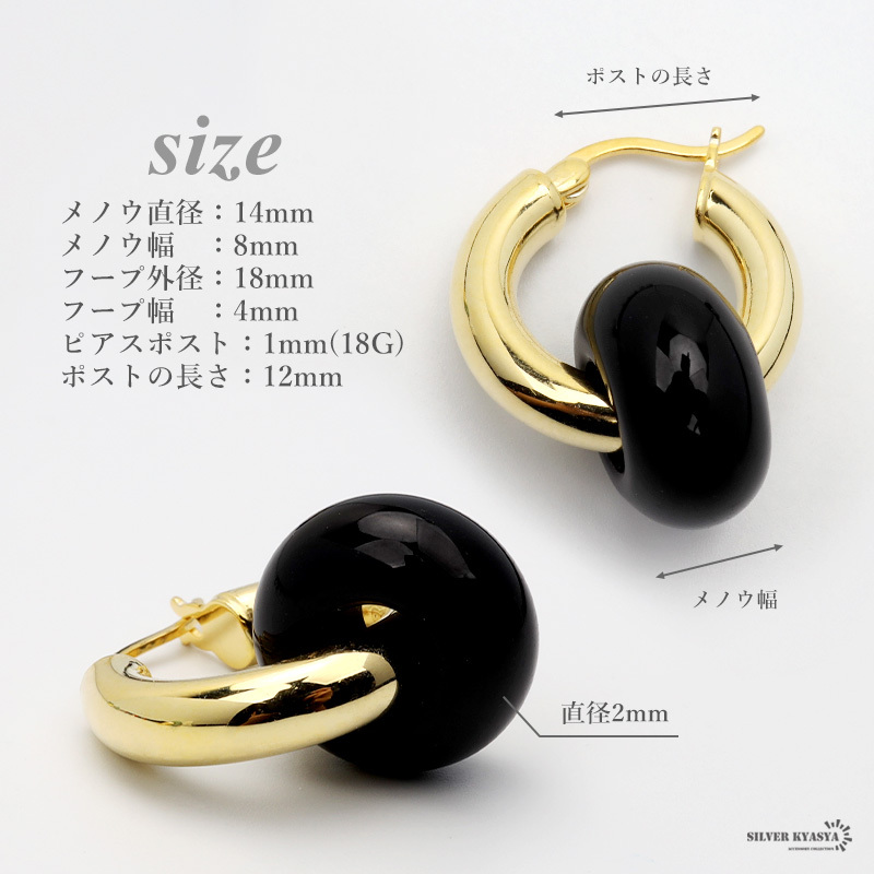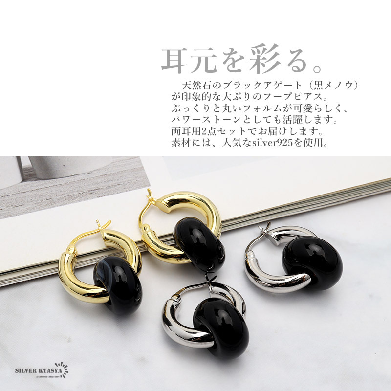 天然石のブラックアゲート(黒メノウ)が印象的な大ぶりのフープピアス。ぷっくりと丸いフォルムが可愛らしく、パワーストーンとしても活躍します。