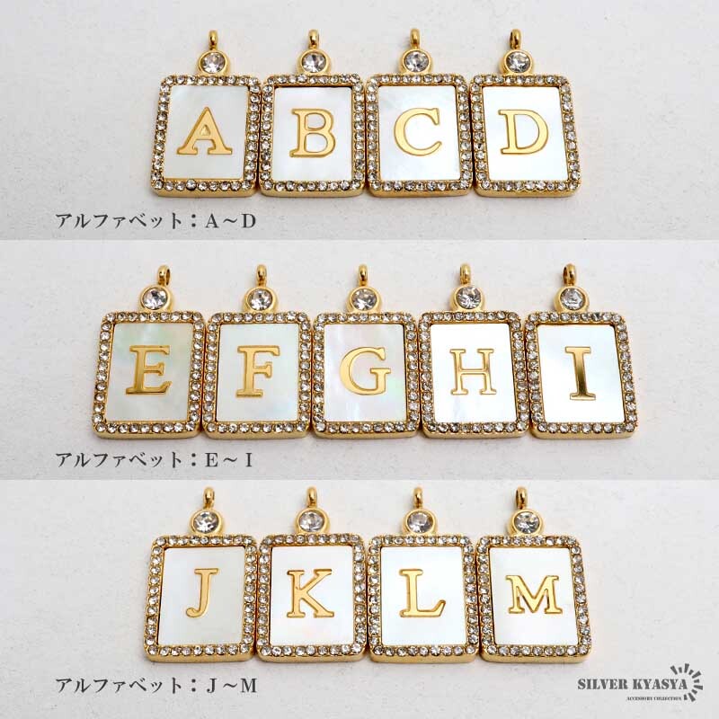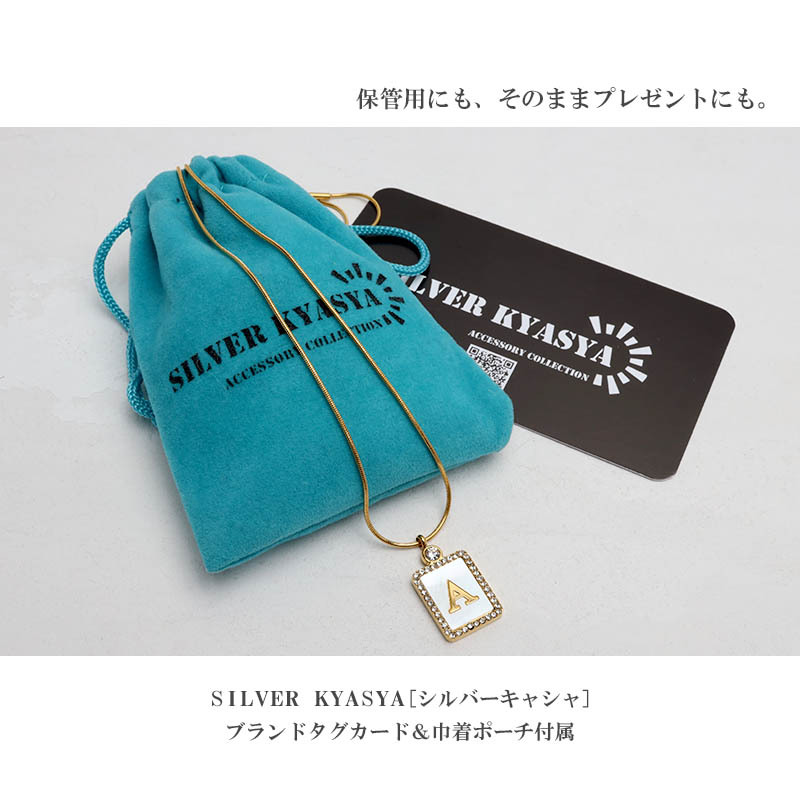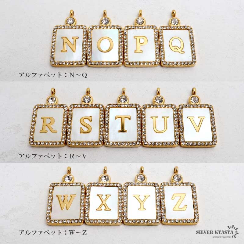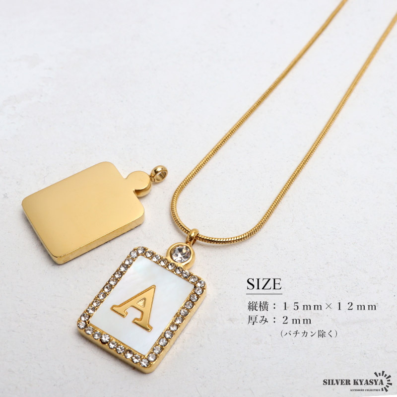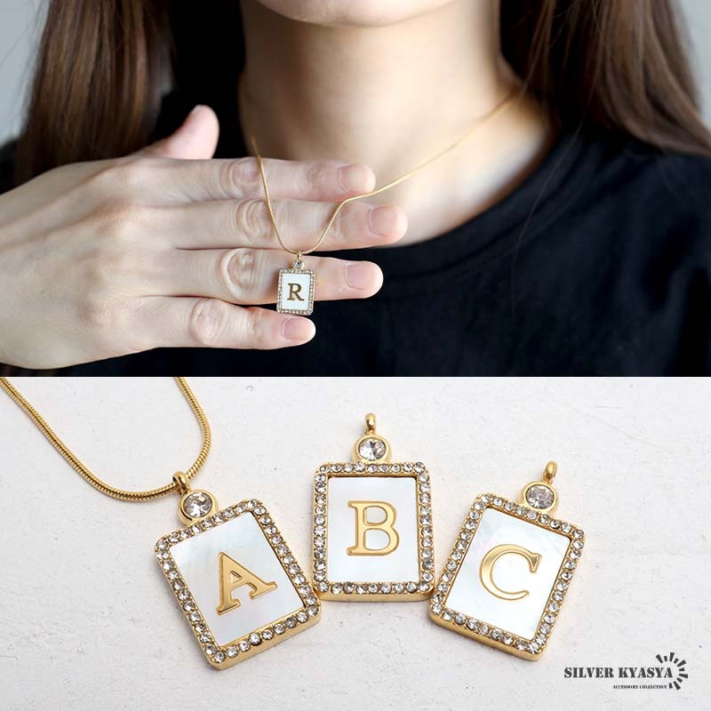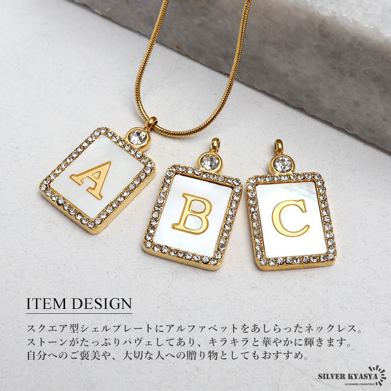 スクエア型シェルプレートにアルファベットをあしらったネックレス。ストーンがたっぷりパヴェしてあり、キラキラと華やかに輝きます。自分へのご褒美や、大切な人への贈り物としてもおすすめ。