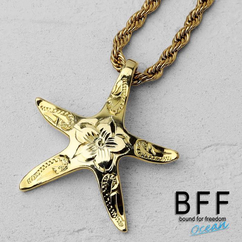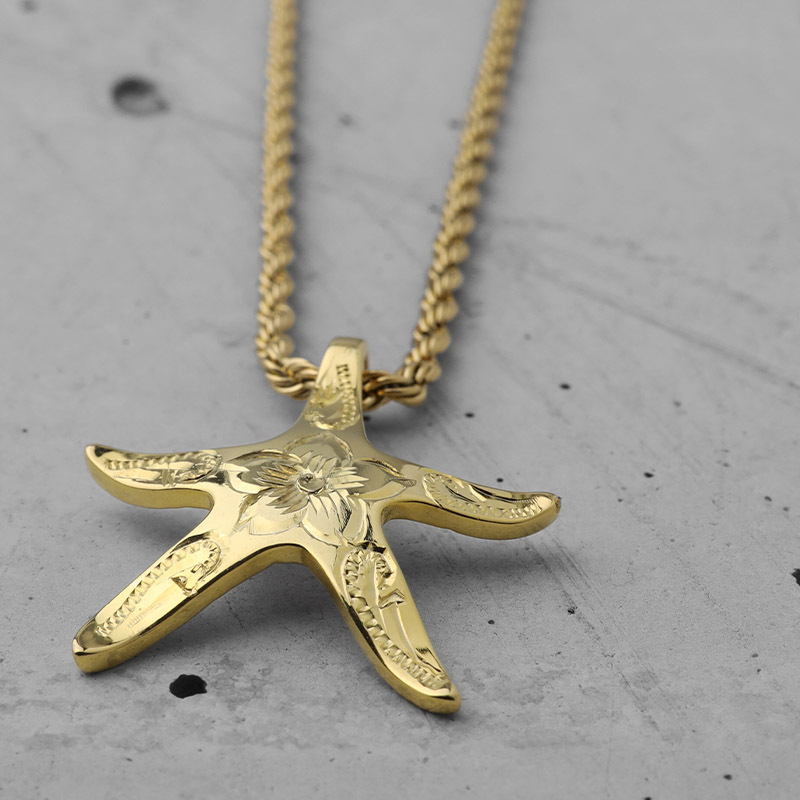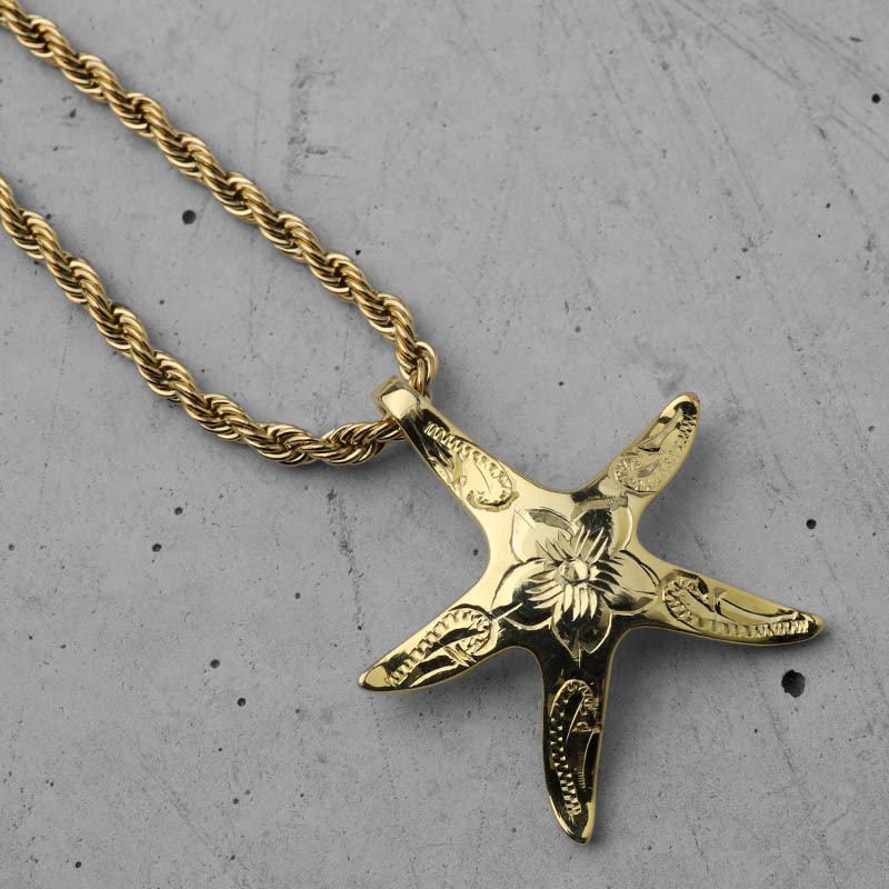 | 商品概要 | ■ヒトデモチーフネックレス ハワイでは「海の星」と呼ばれ、「夢が叶う」と親しまれているヒトデを、立体感あふれる仕上がりに表現したトップを据えたネックレス。表面には職人による手掘りのプルメリアとスクロールの彫金を施した気品を兼ね備えたアイテム。 |