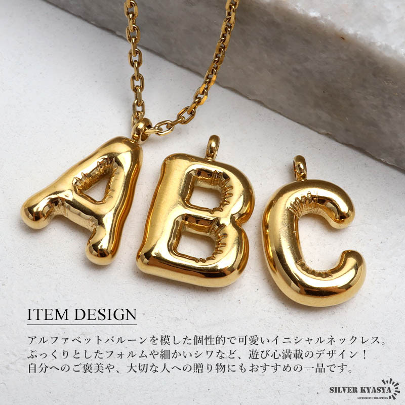 アルファベットバルーンを模した個性的で可愛いイニシャルネックレス。ぷっくりとしたフォルムや細かいシワなど、遊び心満載のデザイン!自分へのご褒美や、大切な人への贈り物にもおすすめの一品です。
