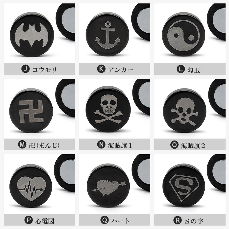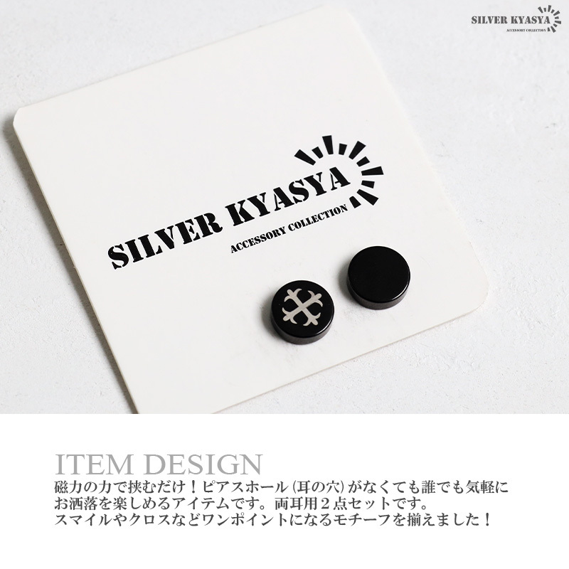 ピアスホールが無くても使えるマグネットピアス。本体と付属のマグネットで耳に挟むだけで装着できます。全20タイプの個性的なワンポイントになるマークを選べます。