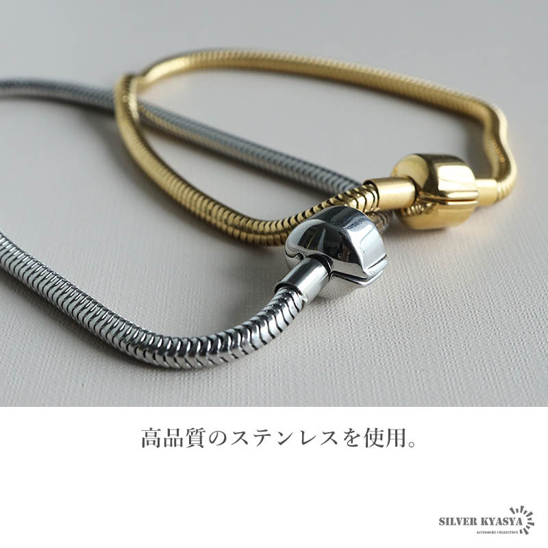 商品概要 | ■ITEM DESIGN スネークチェーンを使用したシンプルなチェーンブレスレット。センターのワンタッチ留め具がさりげないデザインのポイントに。 ■ステンレス素材を使用 金属部分は頑丈なことで知られるステンレス素材を採用。耐久性はもちろん耐水性も高く水場での着用も可能。金属アレルギーも出にくいとされている金属です。 |