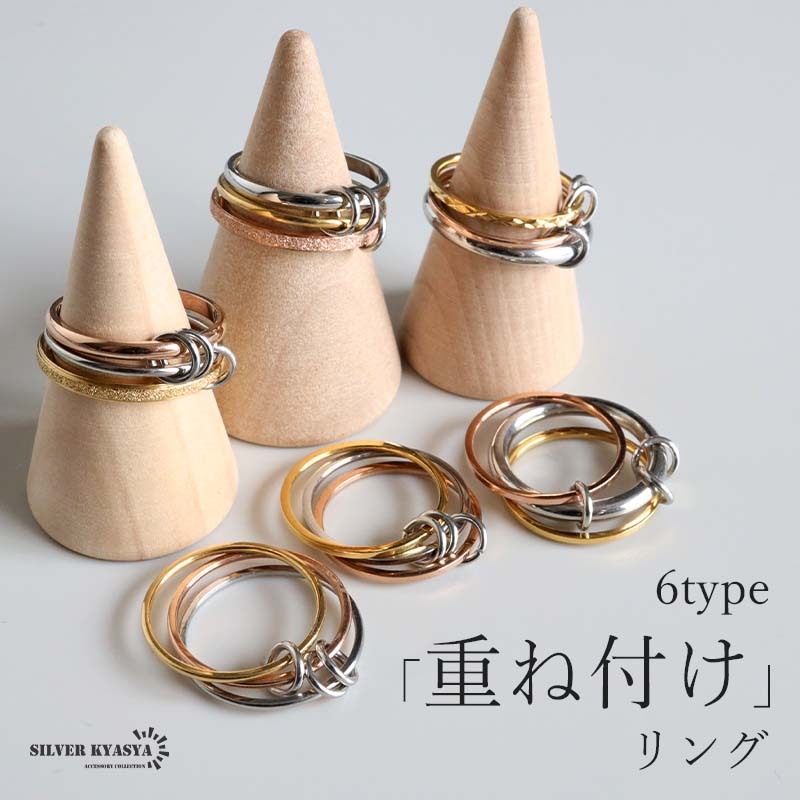 様々なデザインのリングを重ねた3色3連リング。マルチカラーが映えるアイテムです。単体で重ね付けのようなデザインを楽しめます。
